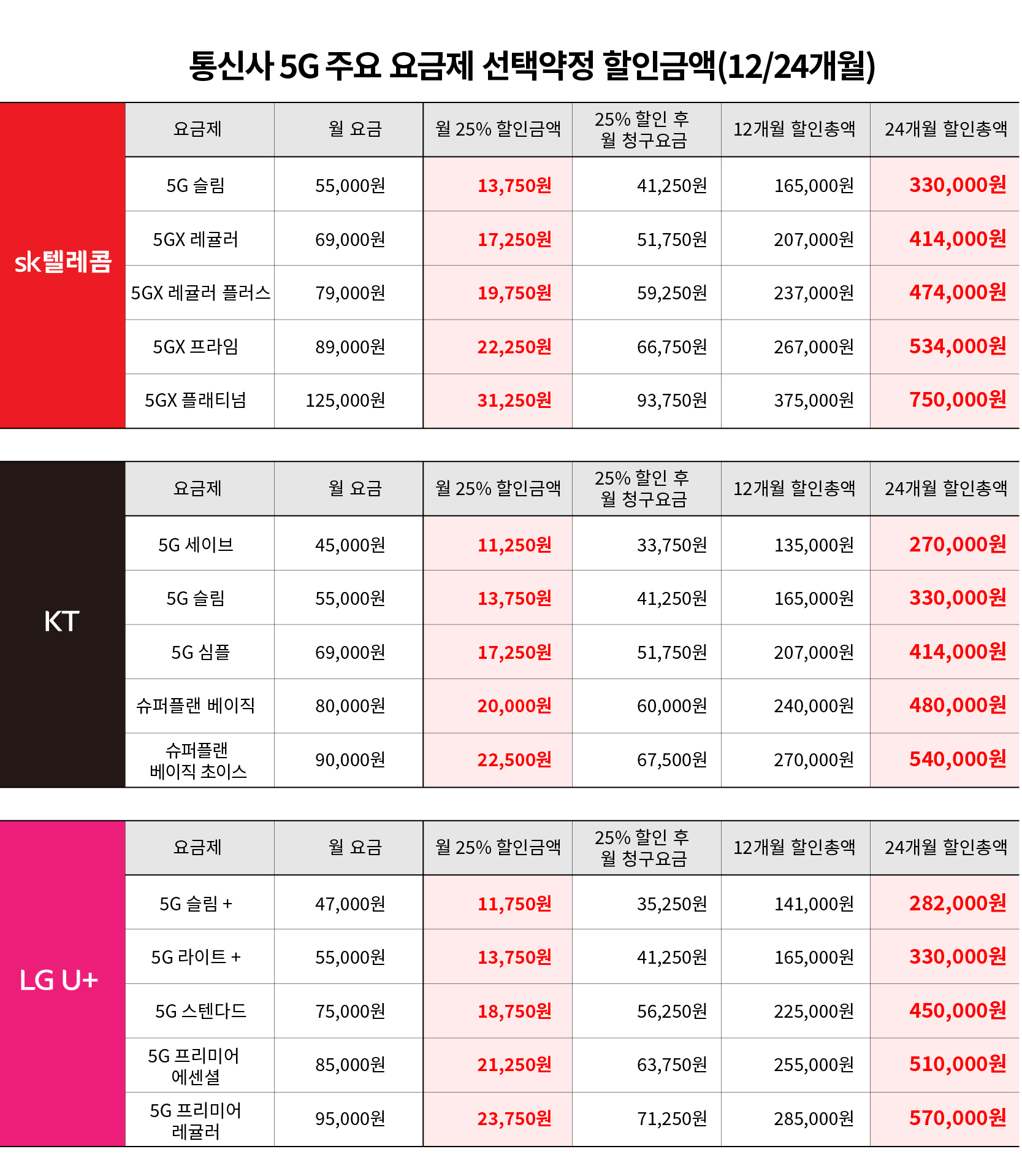 통신사 5G 주요 요금제 선택약정 할인금액 정리(12개월/24개월)
