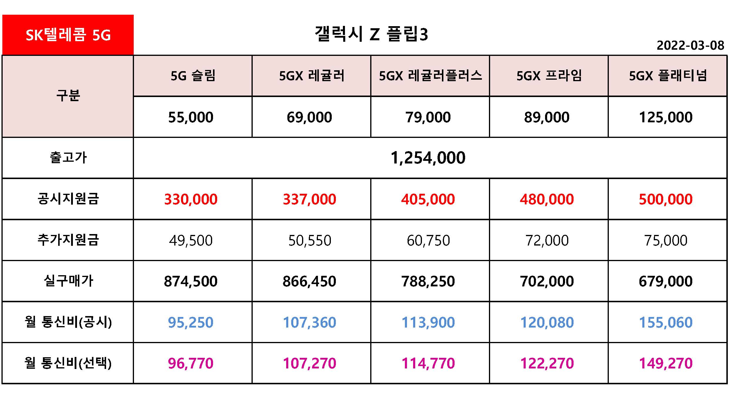 - SK텔레콤 갤럭시 Z플립3 공시지원금 & 선택약정 월 통신비 정리 - 3월 8일 기준