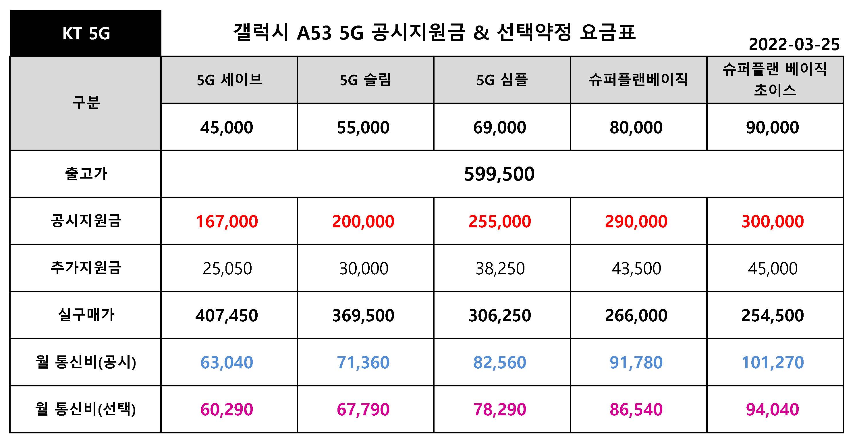 갤럭시 A53 5G 공시지원금 VS 선택약정 월 통신비 정리 - 3월 25일 기준 공시지원금 변경일 까지
