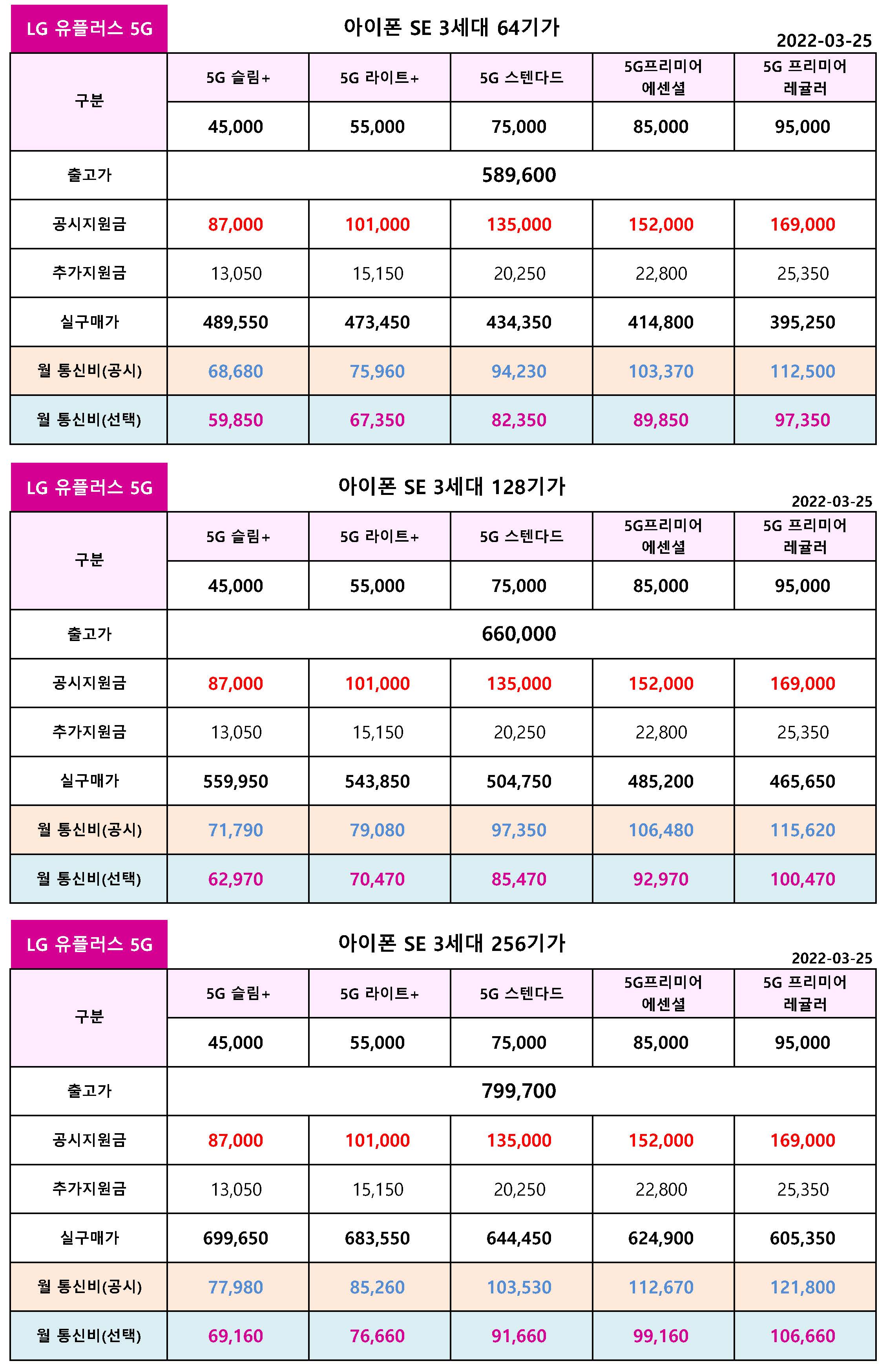 | 아이폰 SE 3세대 공시지원금 상향 공시& 선택약정 월 요금표 정리 - LG 유플러스 5월 13일 (0) | 2022.05.14 |
