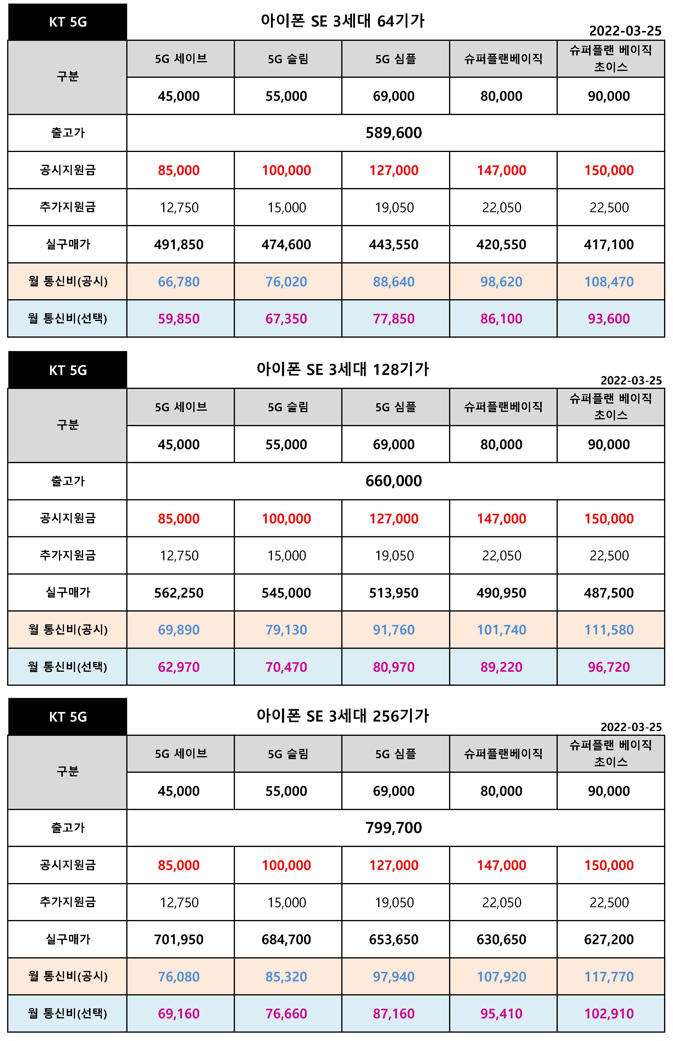 - 아이폰 SE 3세대 공시지원금 VS 선태약정 월 통신비 비교 - 3월 25일기준