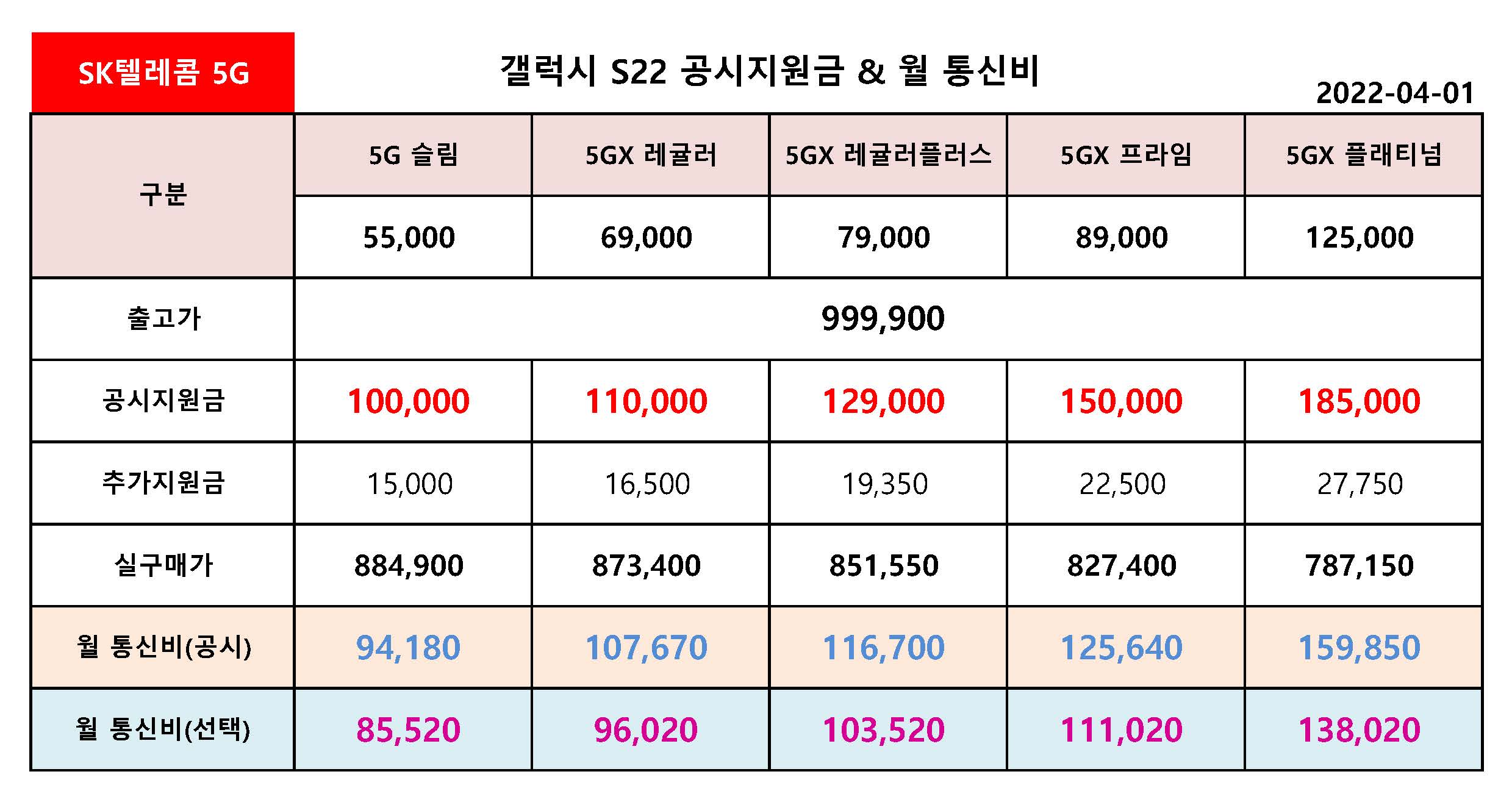 - SKT 갤럭시 S22 공시지원금 VS 선택약정 월 통신비 비교