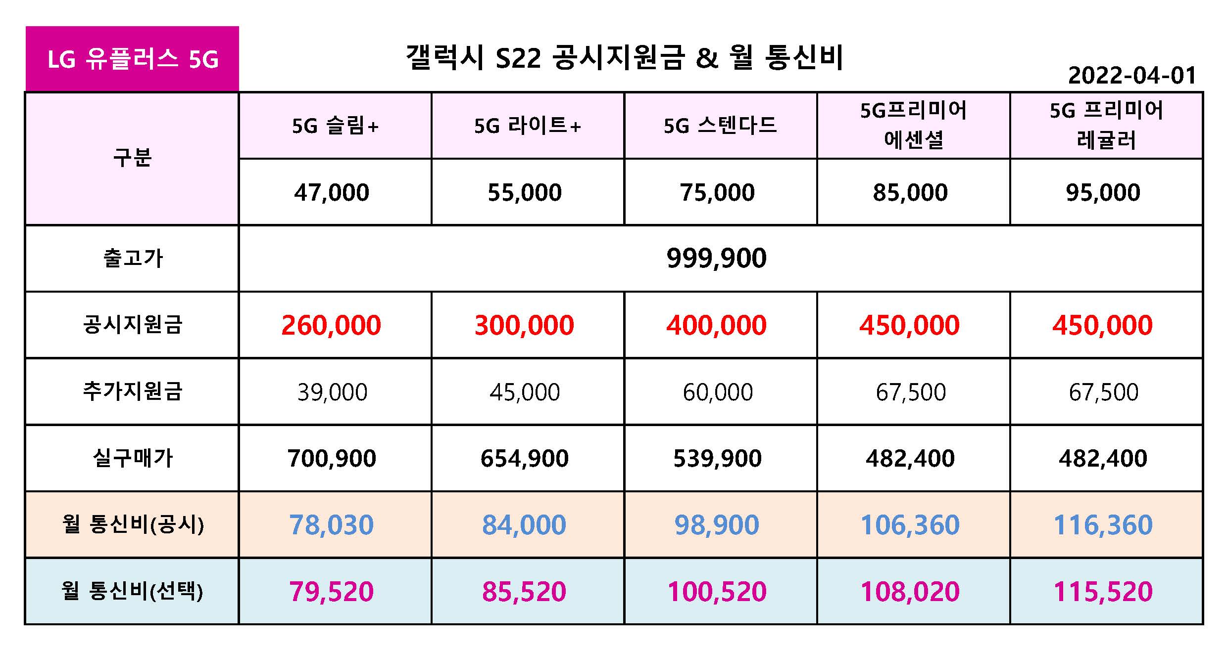 - LG 유플러스 갤럭시 S22 공시지원금 VS 선택약정 월 통신비 비교