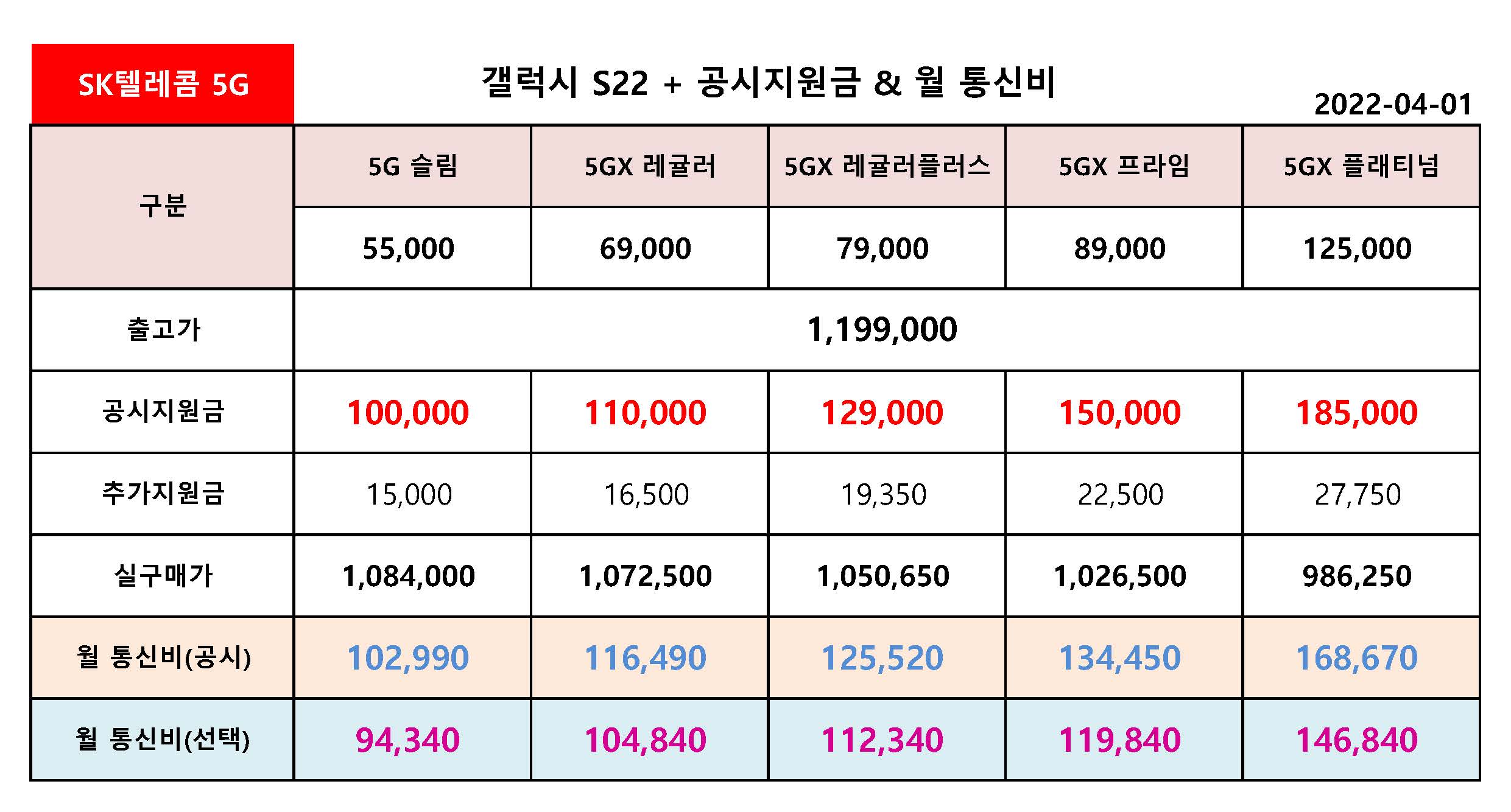 갤럭시 S22 플러스 공시지원금 상향 - 공시지원금 VS 선택약정 월 통신비 비교 - 4월 1일