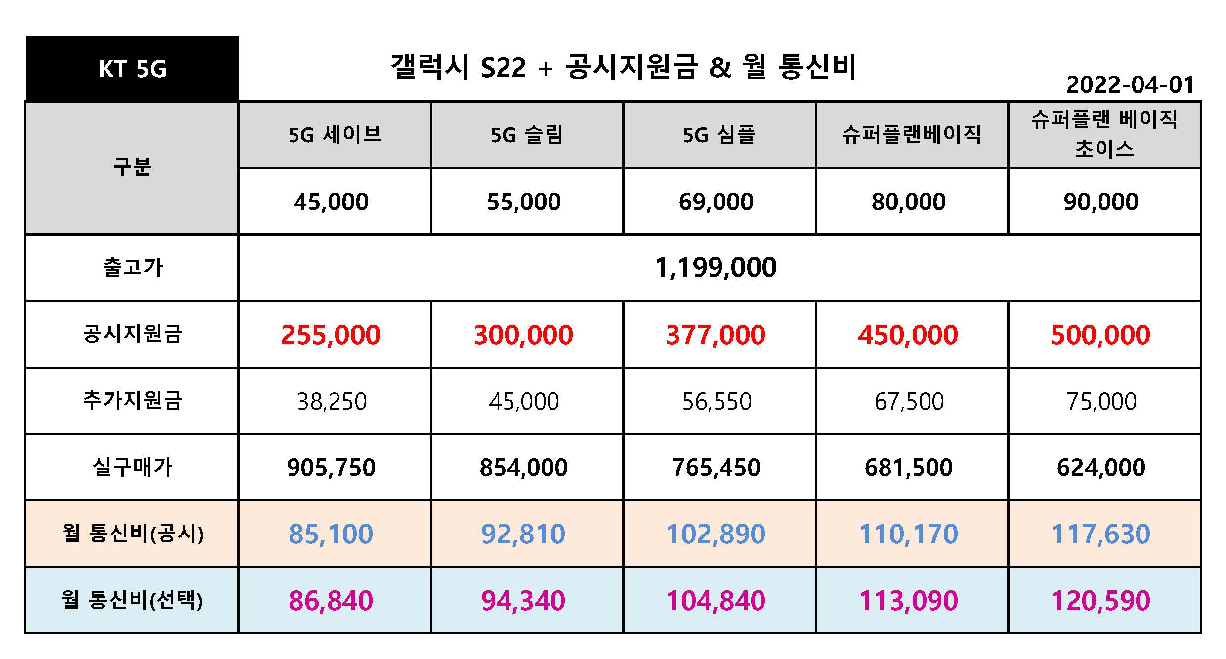 - KT 갤럭시 S22 플러스 공시지원금 VS 선택약정 월 요금표 (소액 오차가 있을수 있습니다)