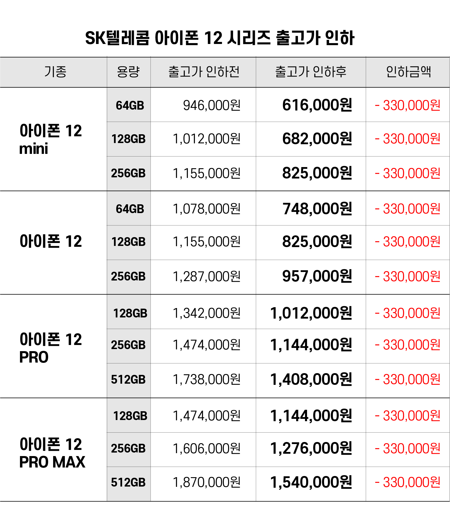 아이폰 12 시리즈 전 기종 -330,000원 정액 출고가 인하를 하였습니다.