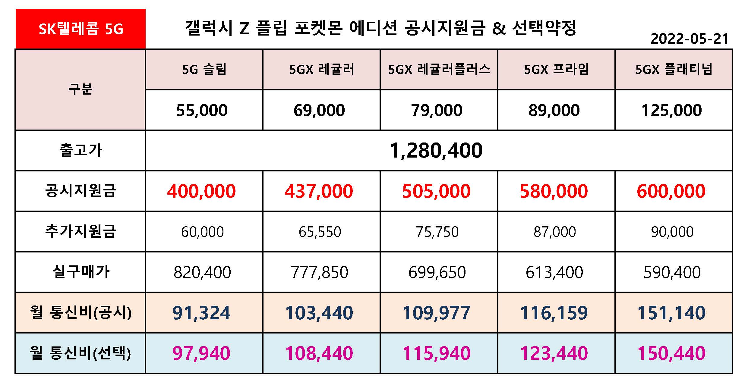 갤럭시 Z 플립 3 포켓몬 에디션 공시지원금 & 선택약정 월 통신비 비교