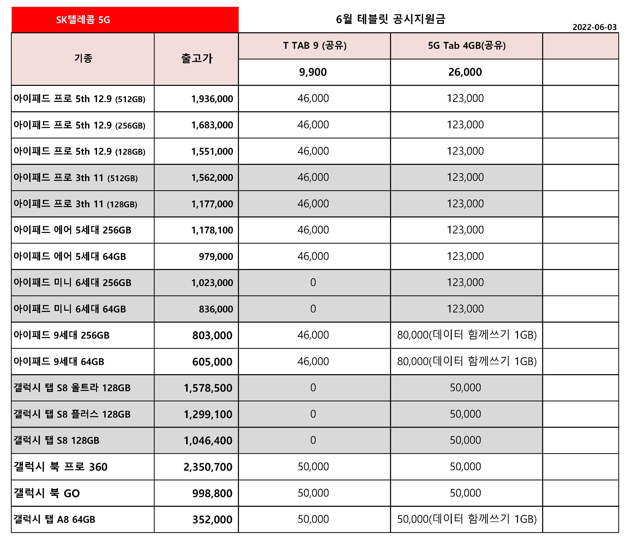 6월 SK텔레콤 주요 테블릿 아이패드, 갤럭시 탭 공시지원금 정리 - 6월 3일 기준