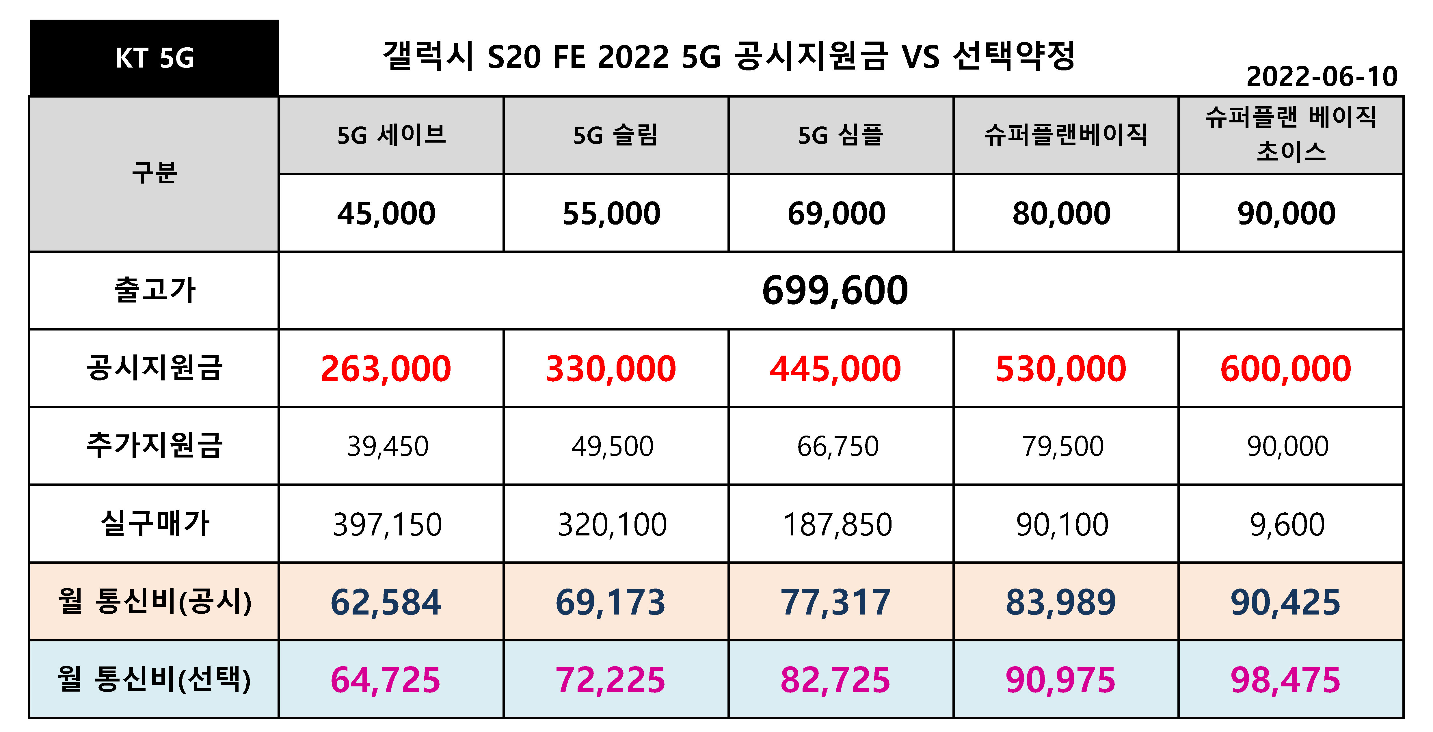 갤럭시 S20 FE 2022 추천 가성비 휴대폰 공짜폰급 공시지원금 상승 - 6월 10일 KT