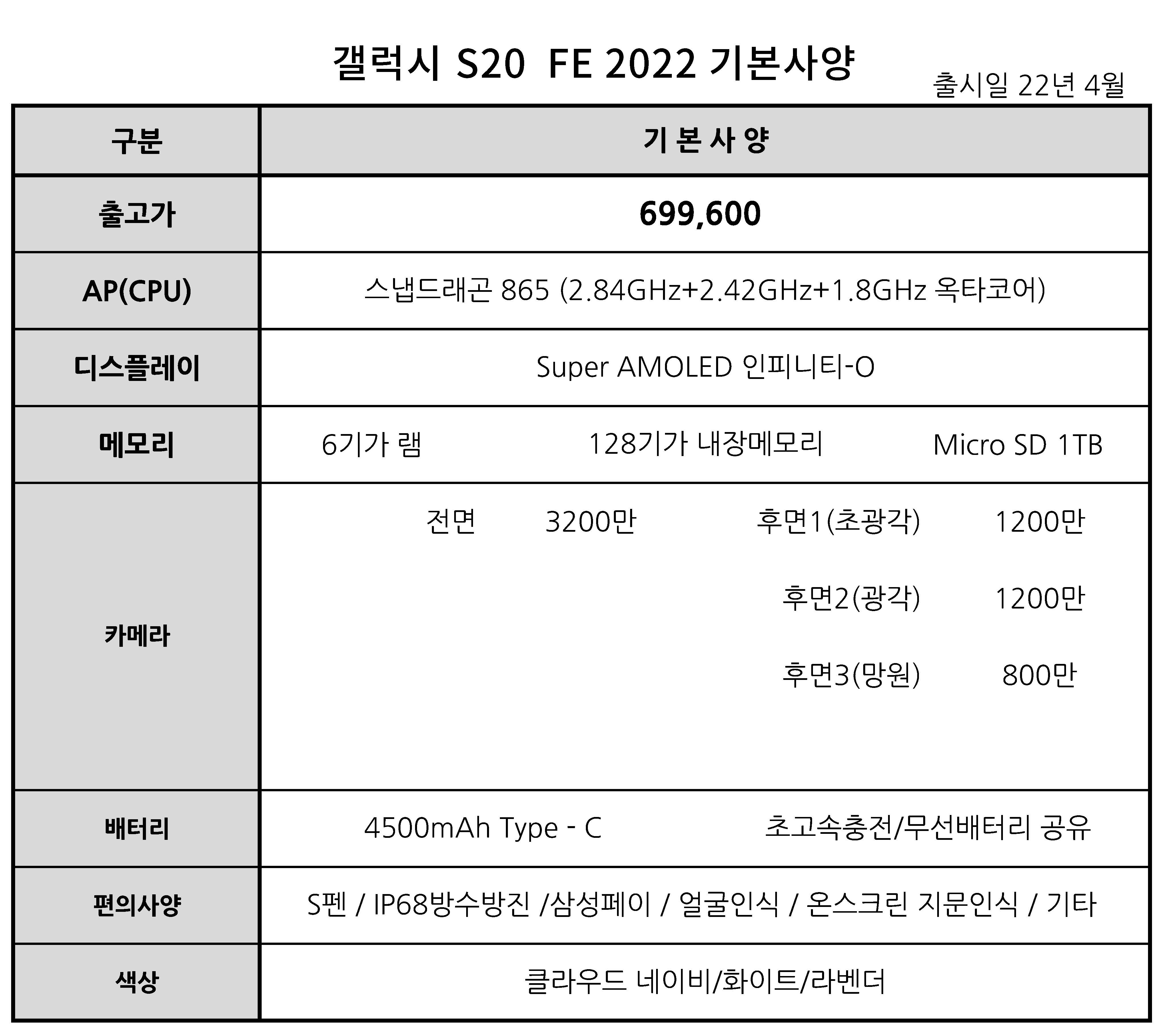 갤럭시 S20 FE 2022는 갤럭시 S20 FE (출시일 20년 10월) 를 2020년에 새로 재출시한 핸드폰 입니다.