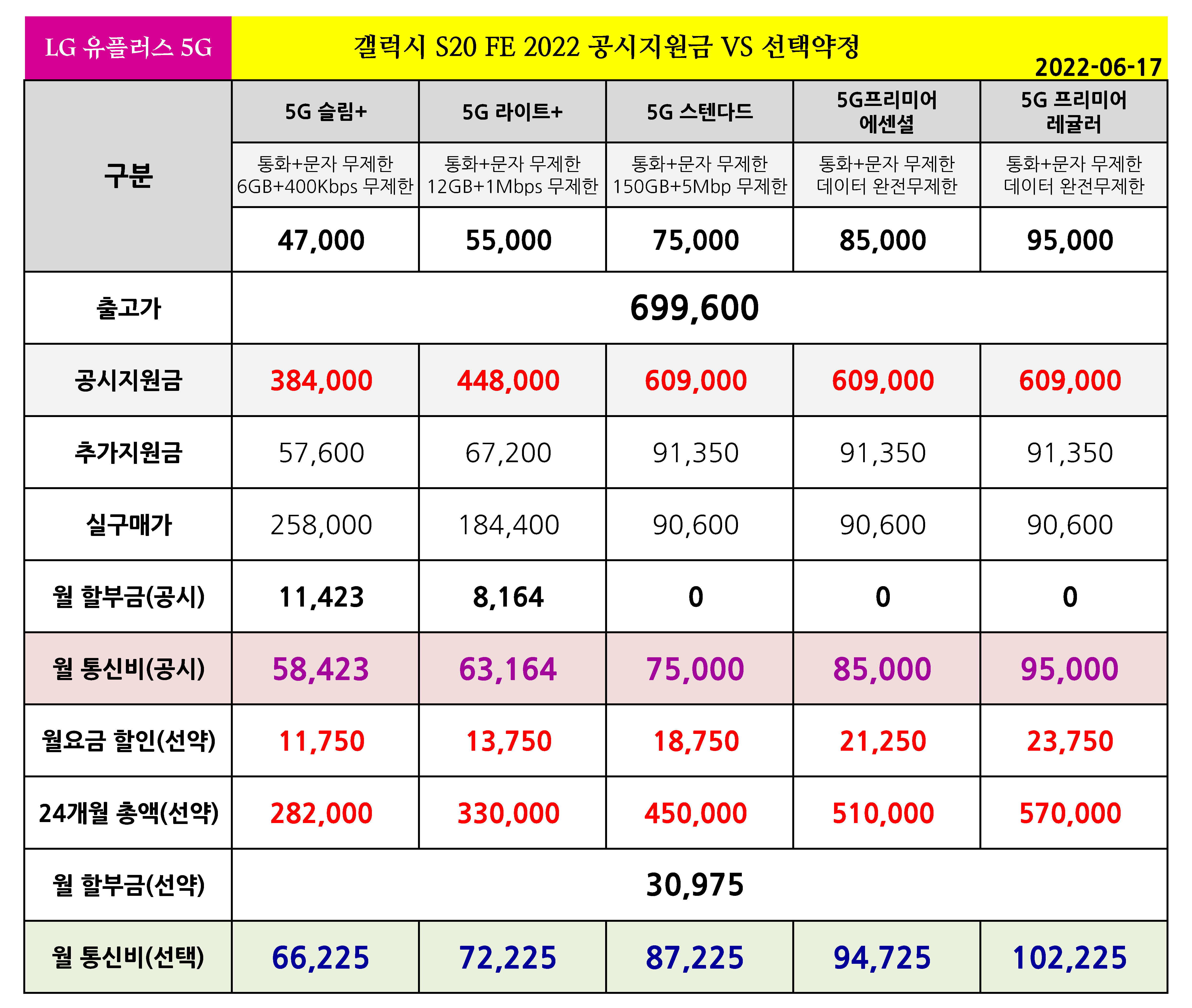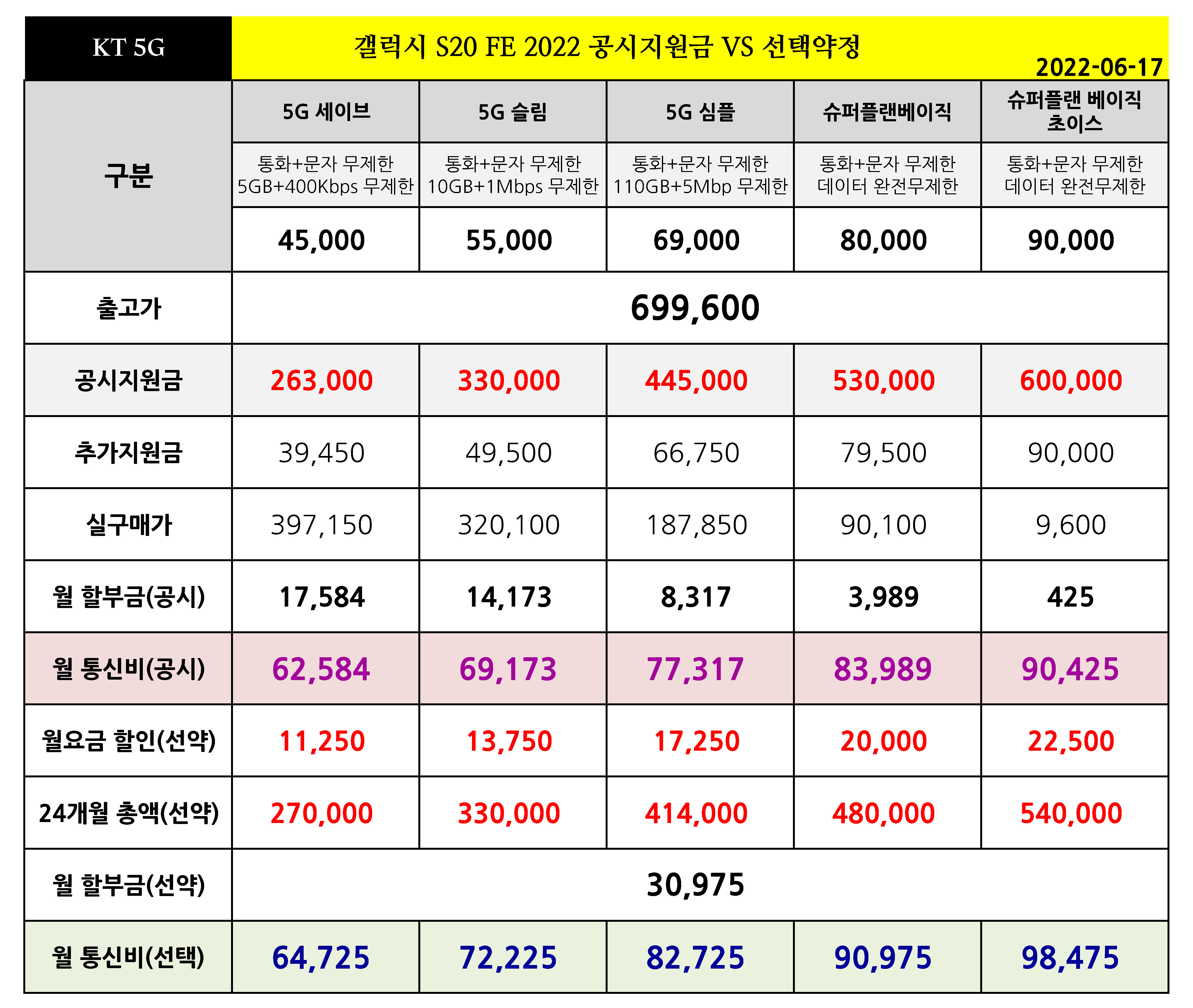 갤럭시 S20 FE 2022 공시지원금 VS 선택약정 월 통신비 비교 - 6월 17일 기준