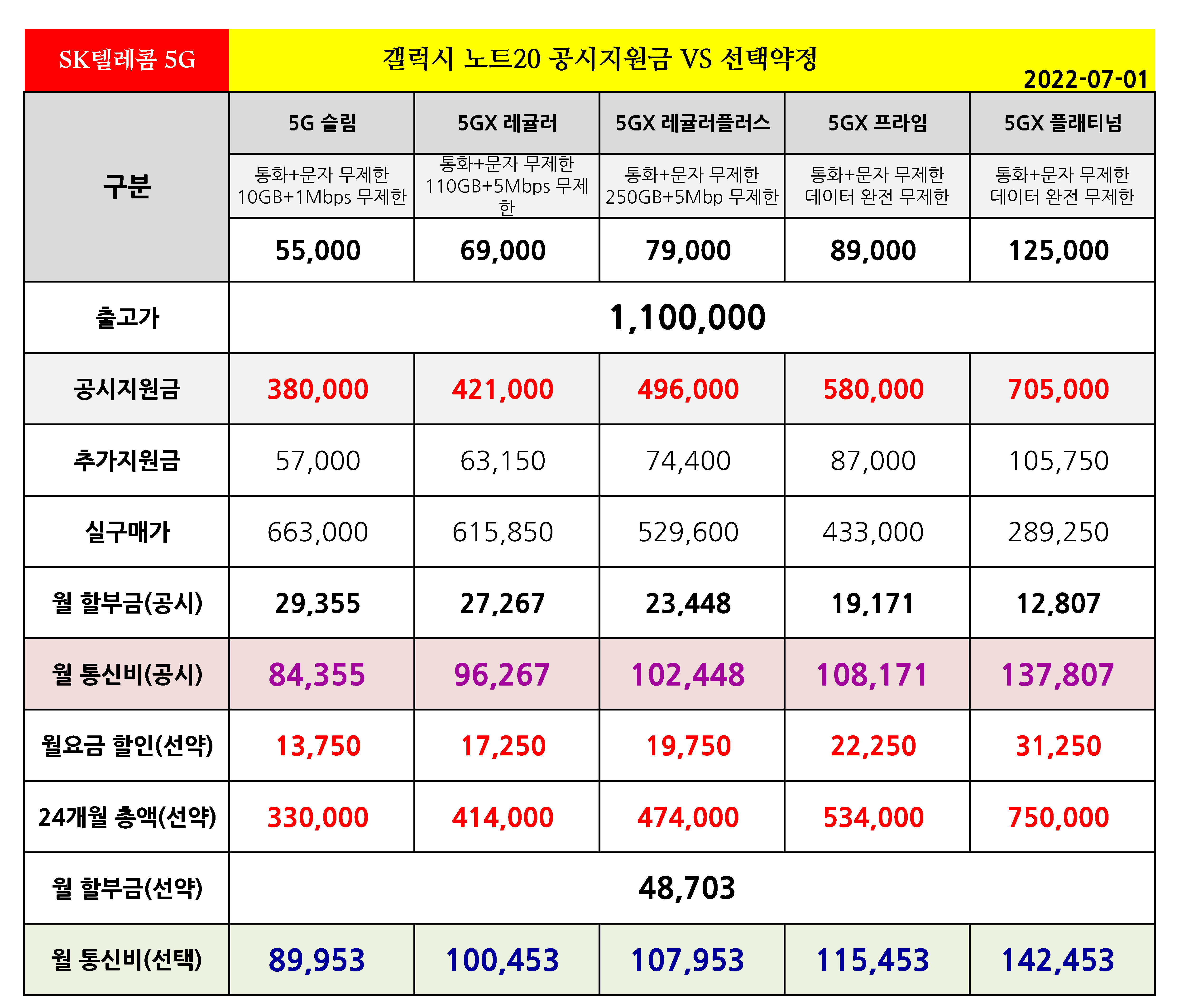 갤럭시 노트 20 공시지원금 VS 선택약정 월 통신비 비교 - 7월 1일 기준