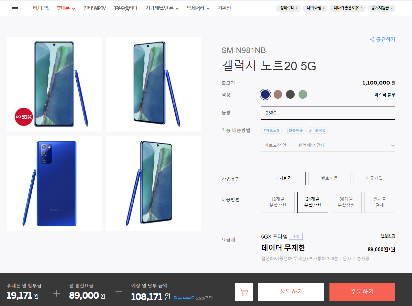 89요금제 기준 갤럭시 노트20 월 할부금은 19,191원 + 월 통신비 89,000원 = 월 통신비 108,171원에 개통할 수 있습니다