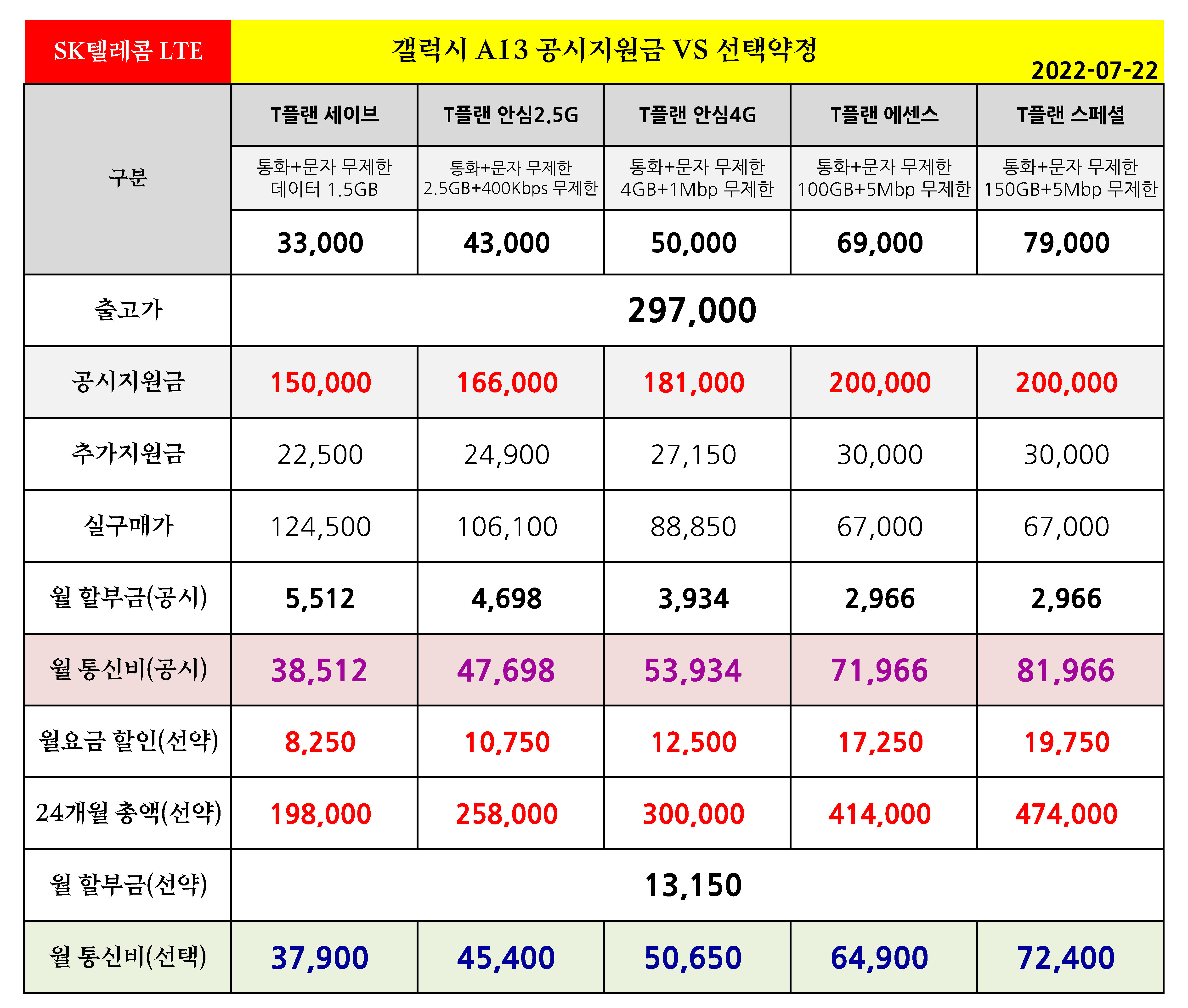 갤럭시 A13 공시지원금 VS 선택약정 월 통신비 비교 - 7월 22일 기준