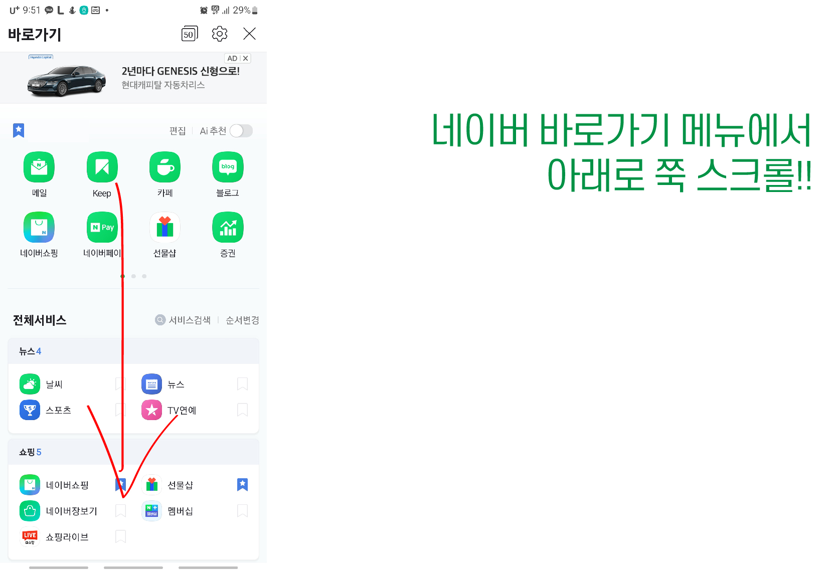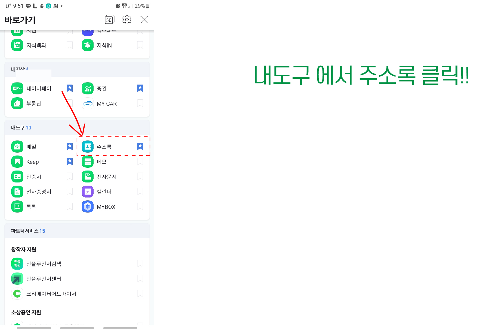 3. 바로가기 창에서 아래로 쭉 내려 주소록 메뉴가 보일때 까지 내려주세요!