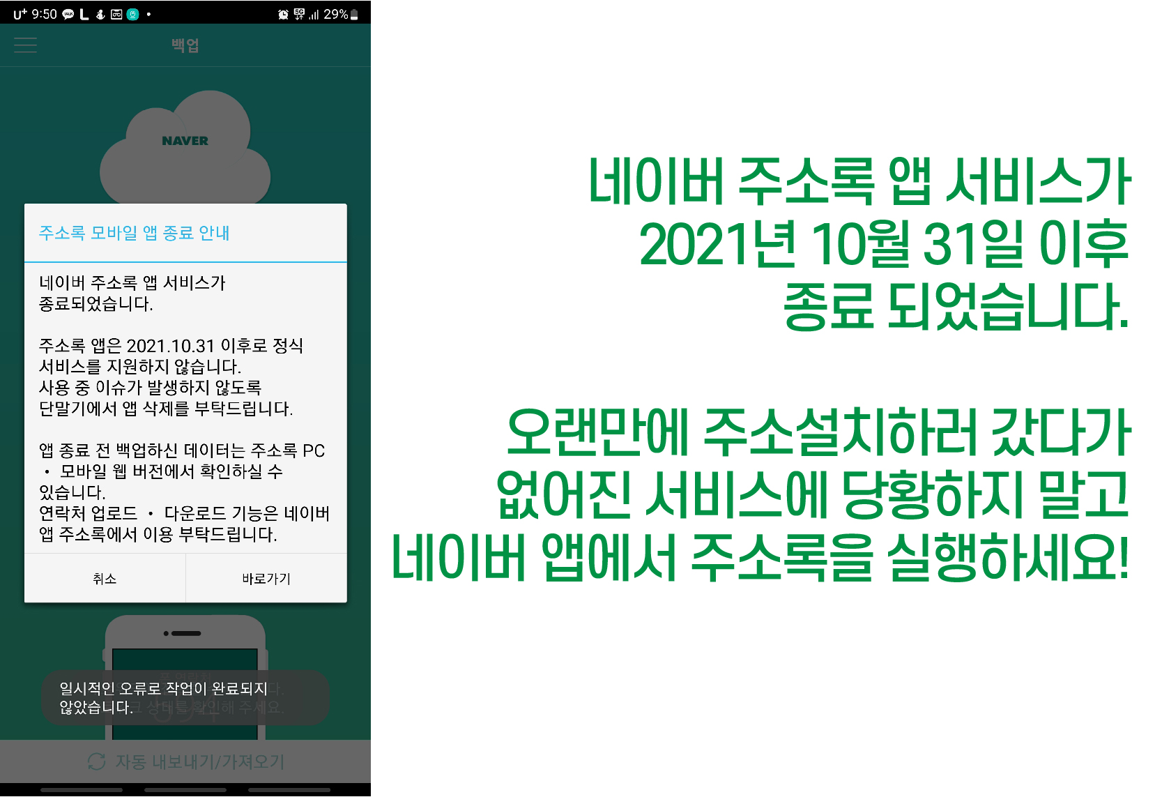네이버 주소록 앱이 서비스를 종료 했습니다.