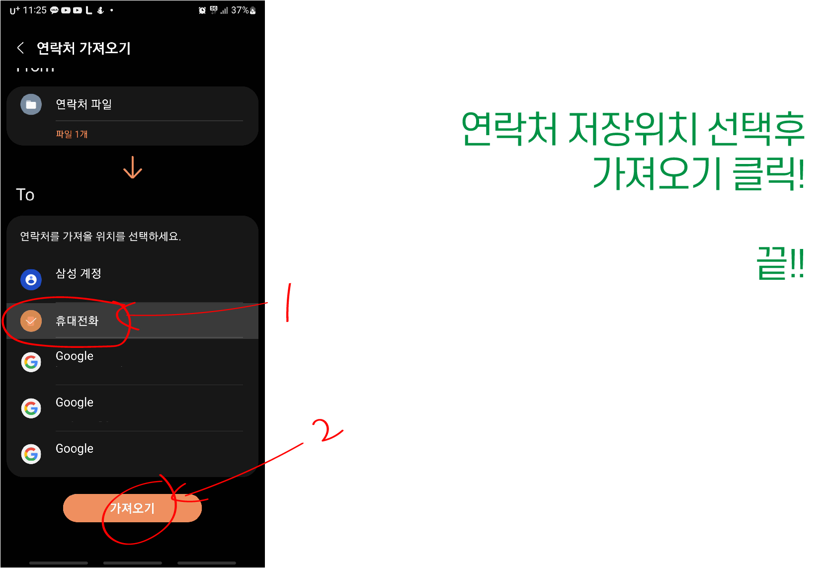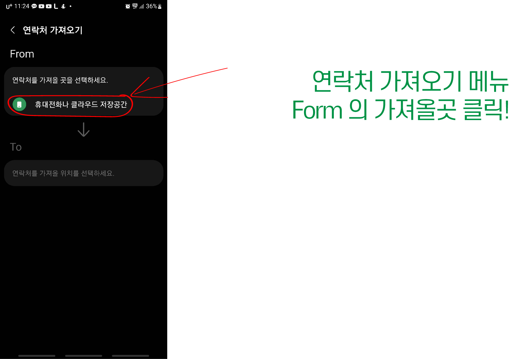 11. From 에서 연락처 가져올 곳을 선택하세요의 아래 메뉴 클릭!