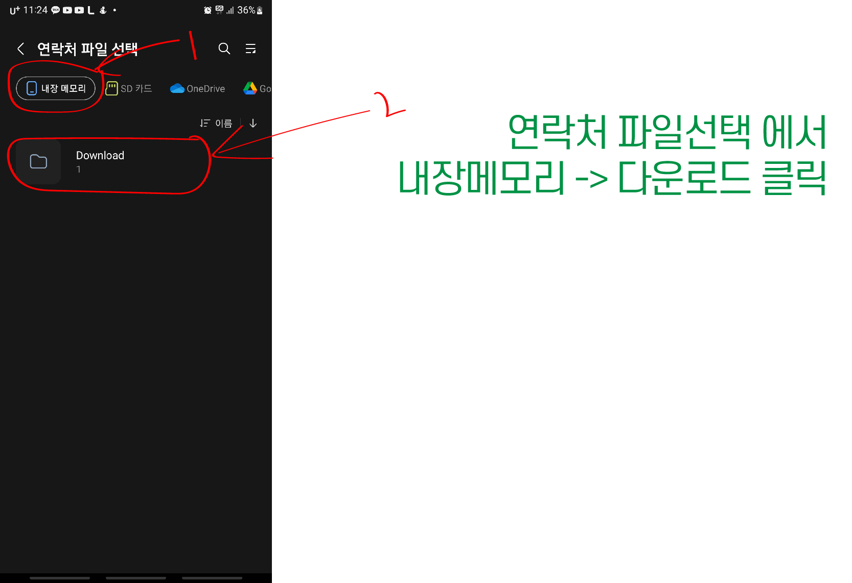 12. 연락처 파일선택 메뉴 -> 내장 메모리 -> 다운로드 폴더 선택
