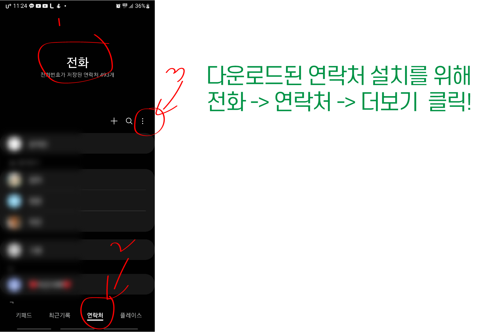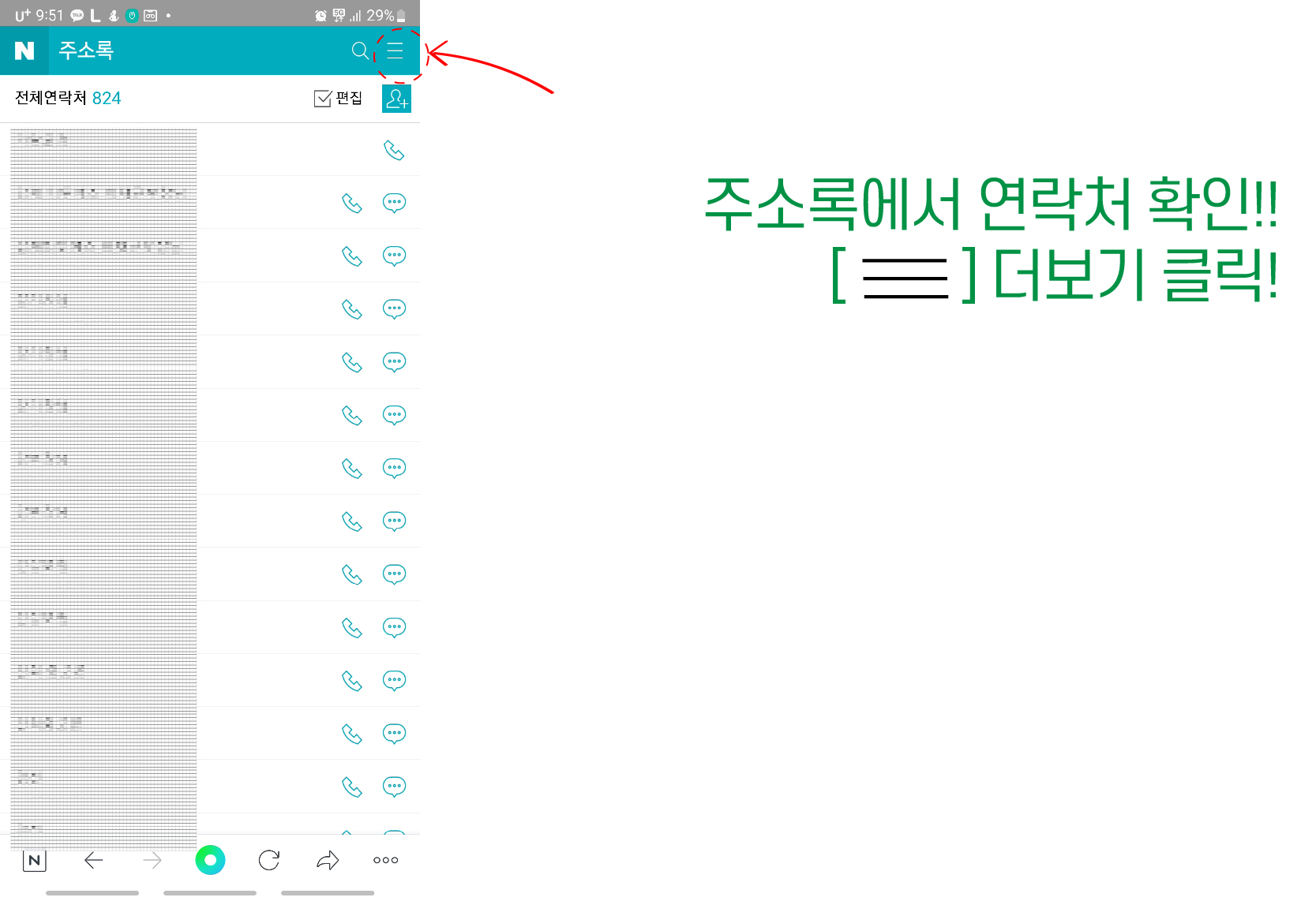 7. 핸드폰의 전화 -> 연락처 -> 더보기 ( 점 3개) 클릭!!