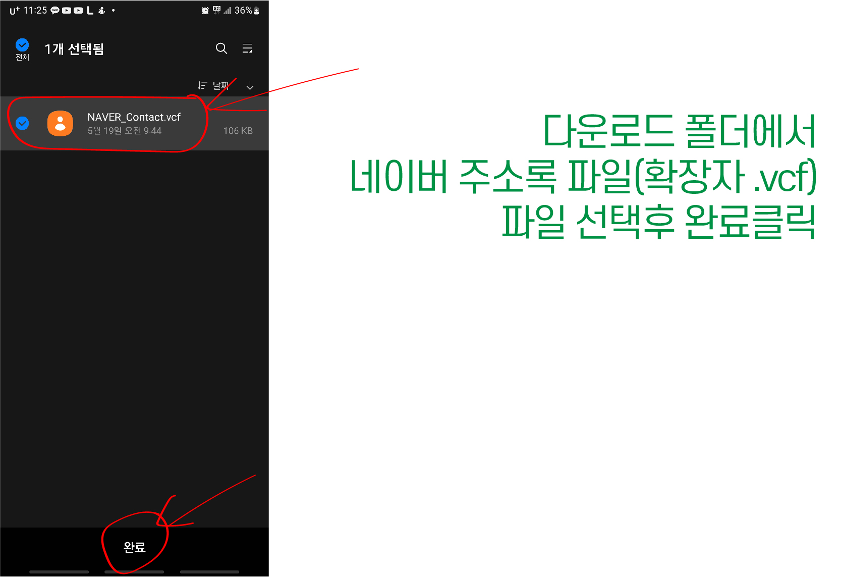 13. 다운로드 받은 네이버 연락처 파일 선택하여 완료 클릭