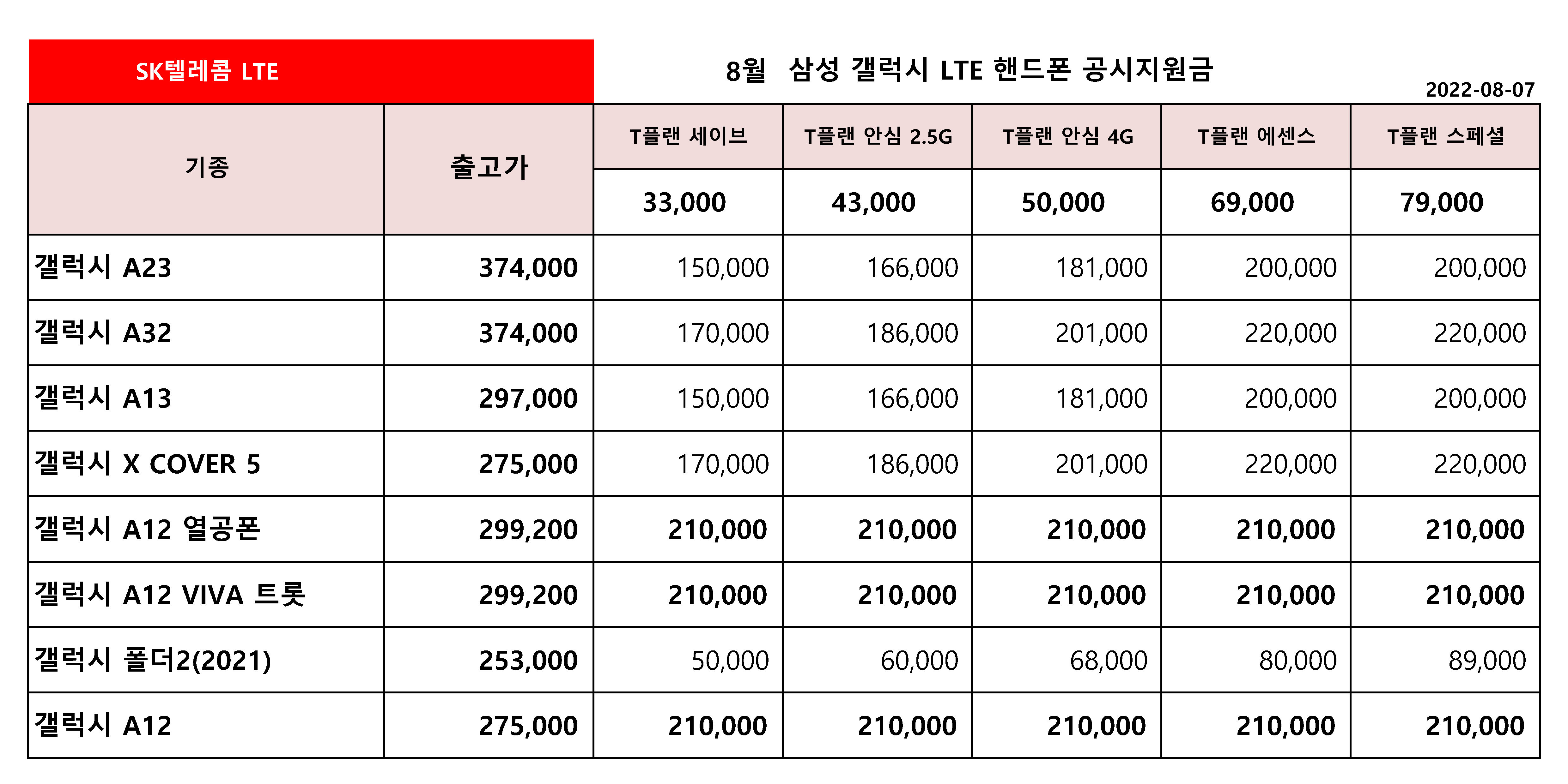 8월 7일 기준 SK텔레콤 주요 핸드폰 공시지원금 정리 입니다.