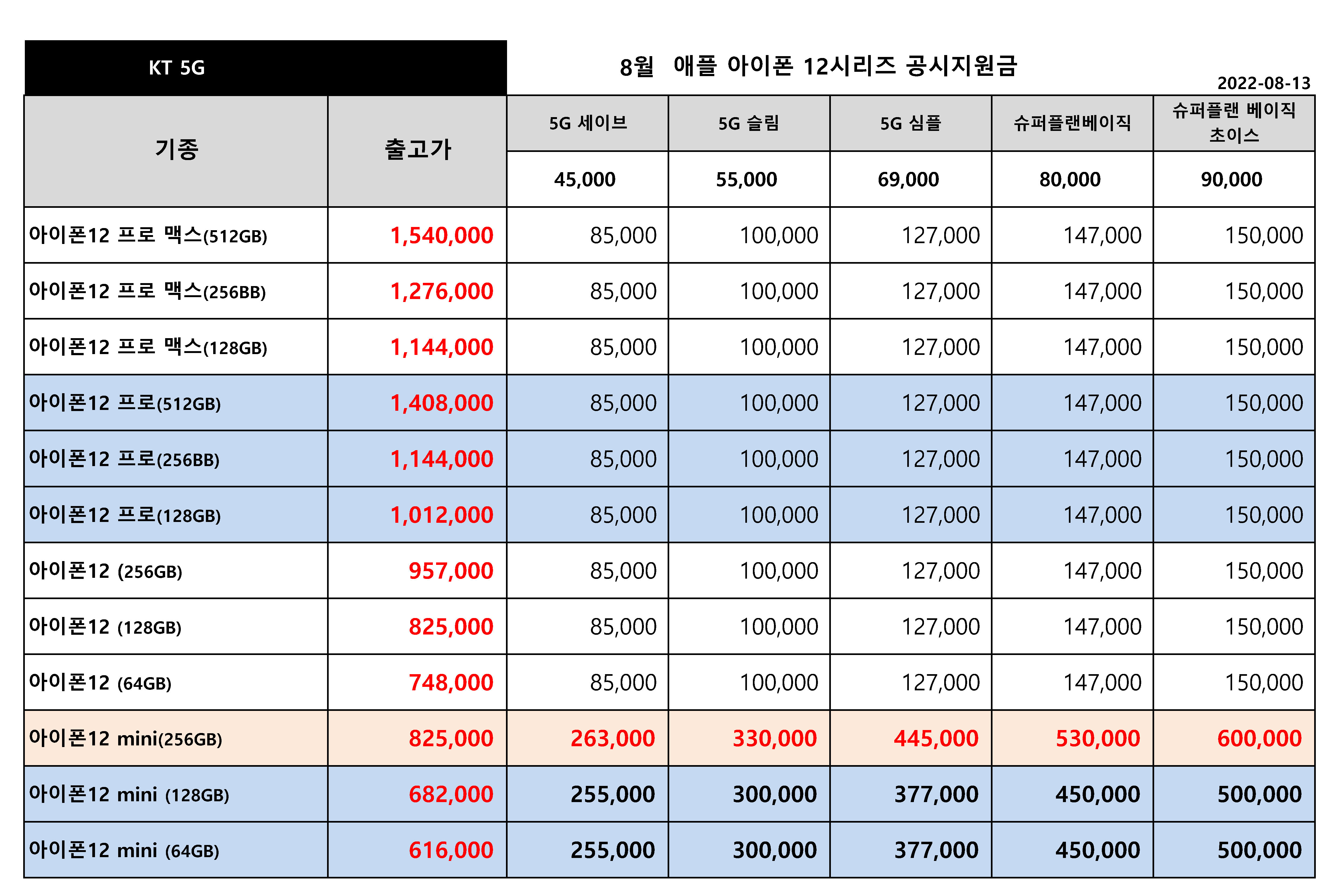 KT 8월 13일지준 KT 주요 핸드폰 공시지원금 정리입니다.
