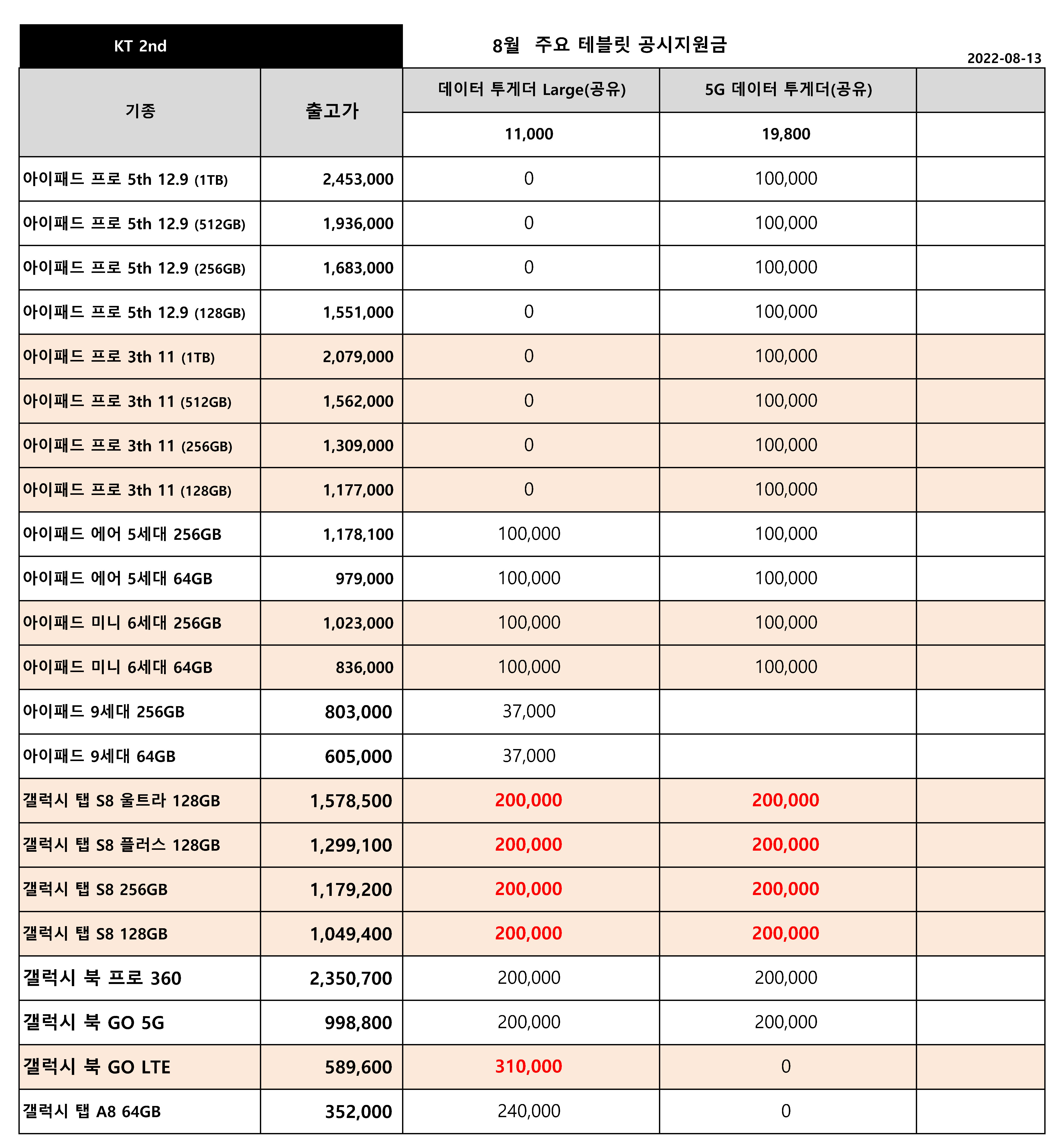 8월 KT 주요 핸드폰 공시지원금 - 8월 13일기준