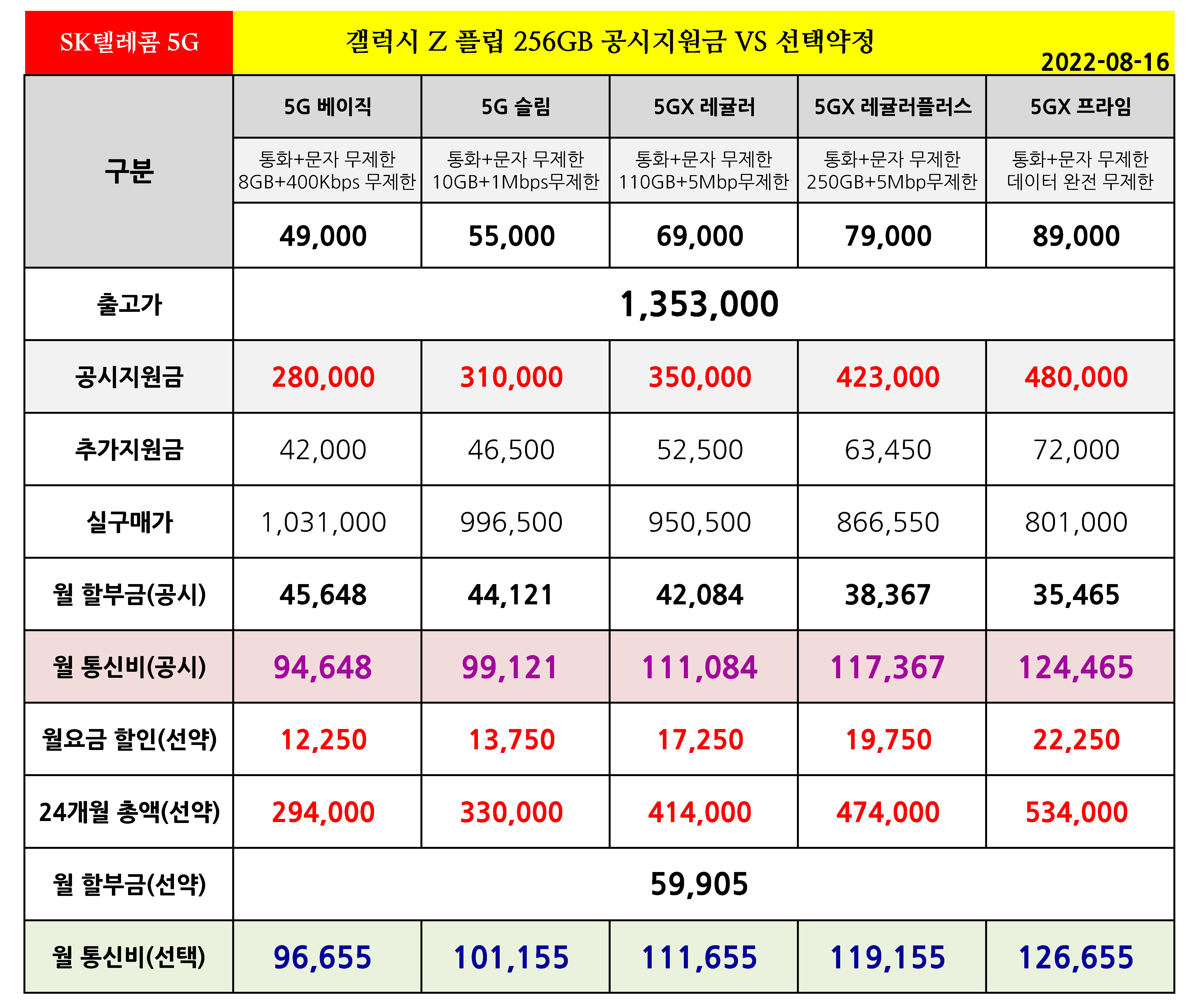 갤럭시 Z 플립4 256GB 공시지원금 VS 선택약정 월 통신비 비교