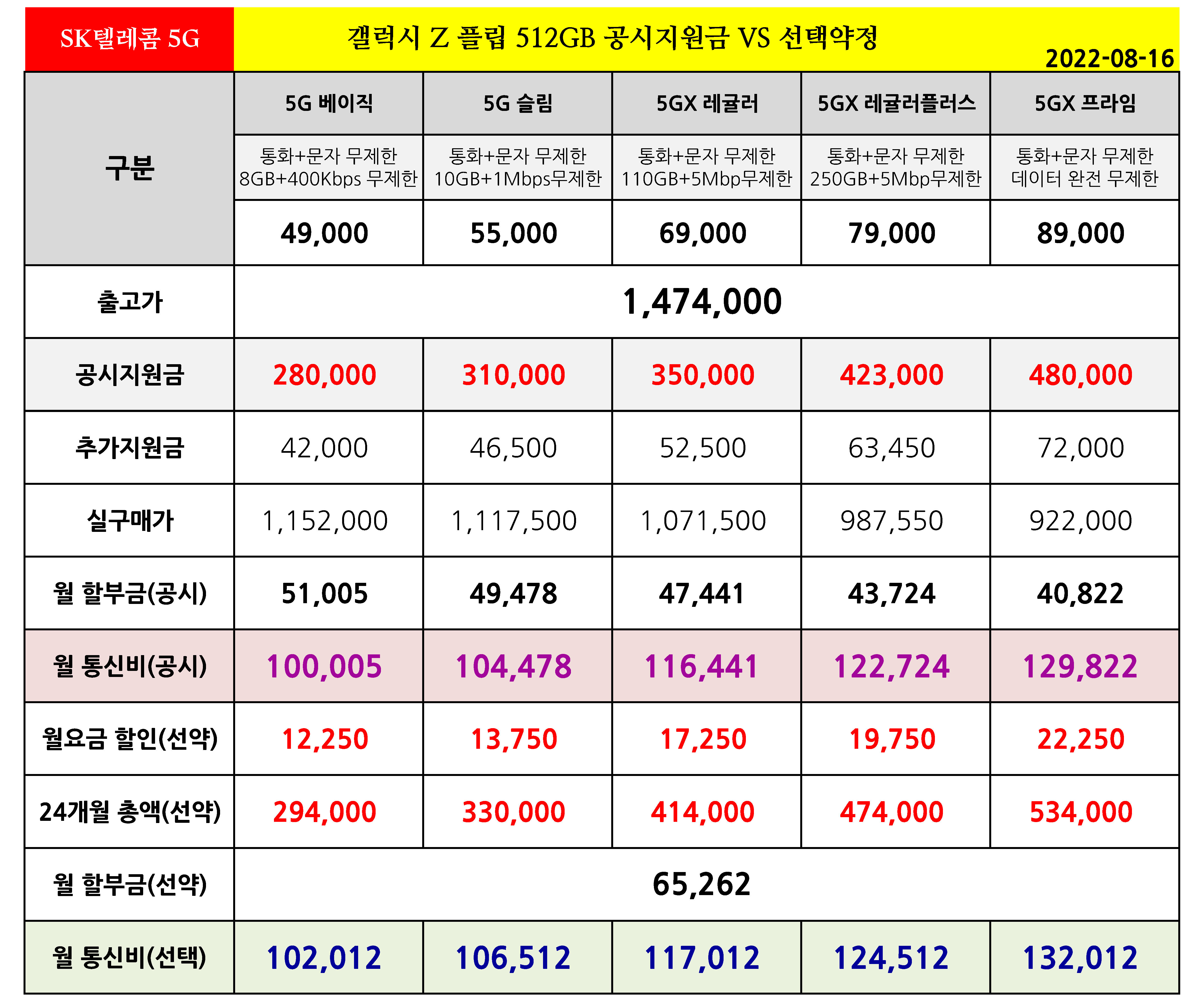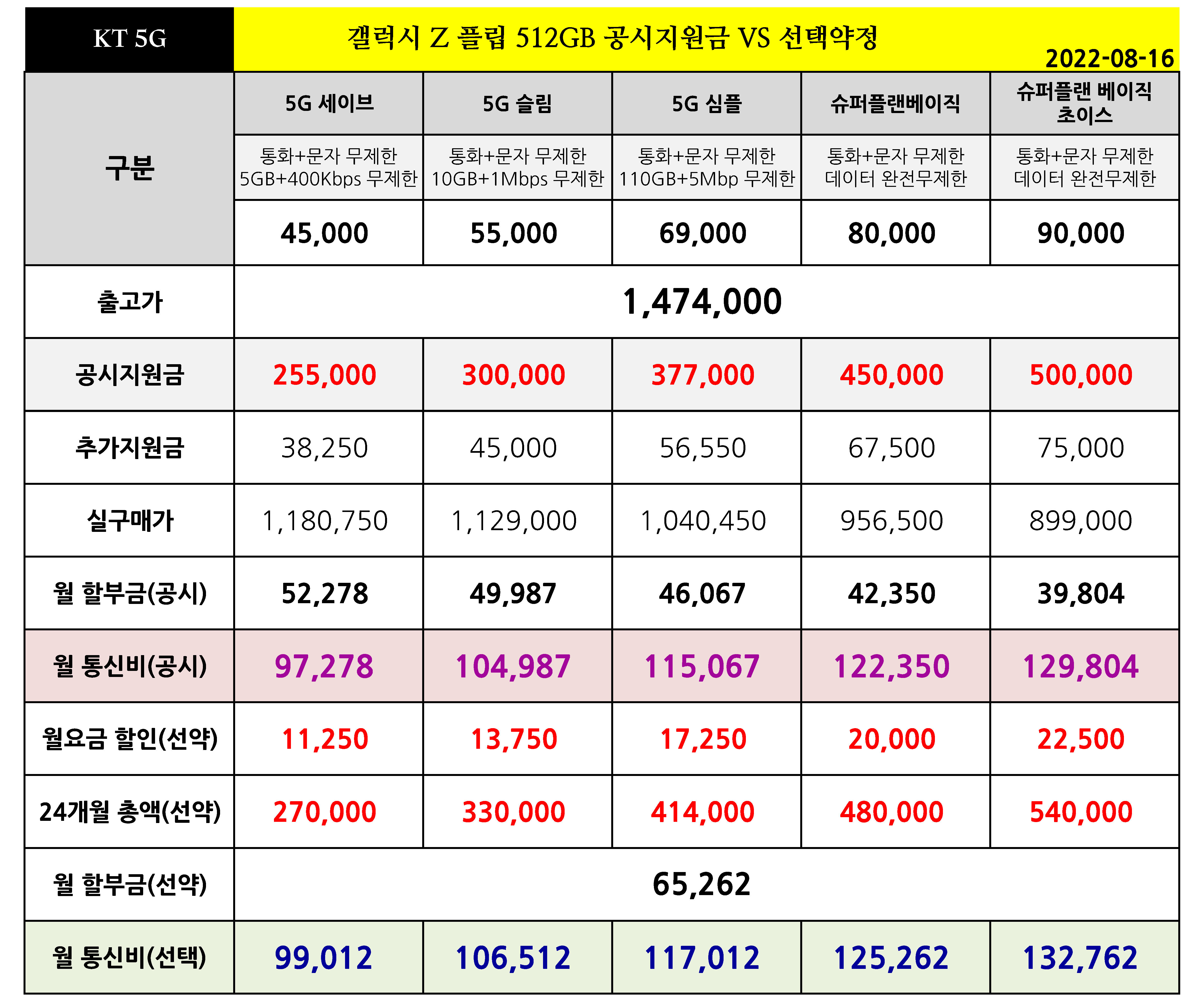 갤럭시 Z 플립4 512기가 공시지원금 VS 선택약정 월 통신비 비교