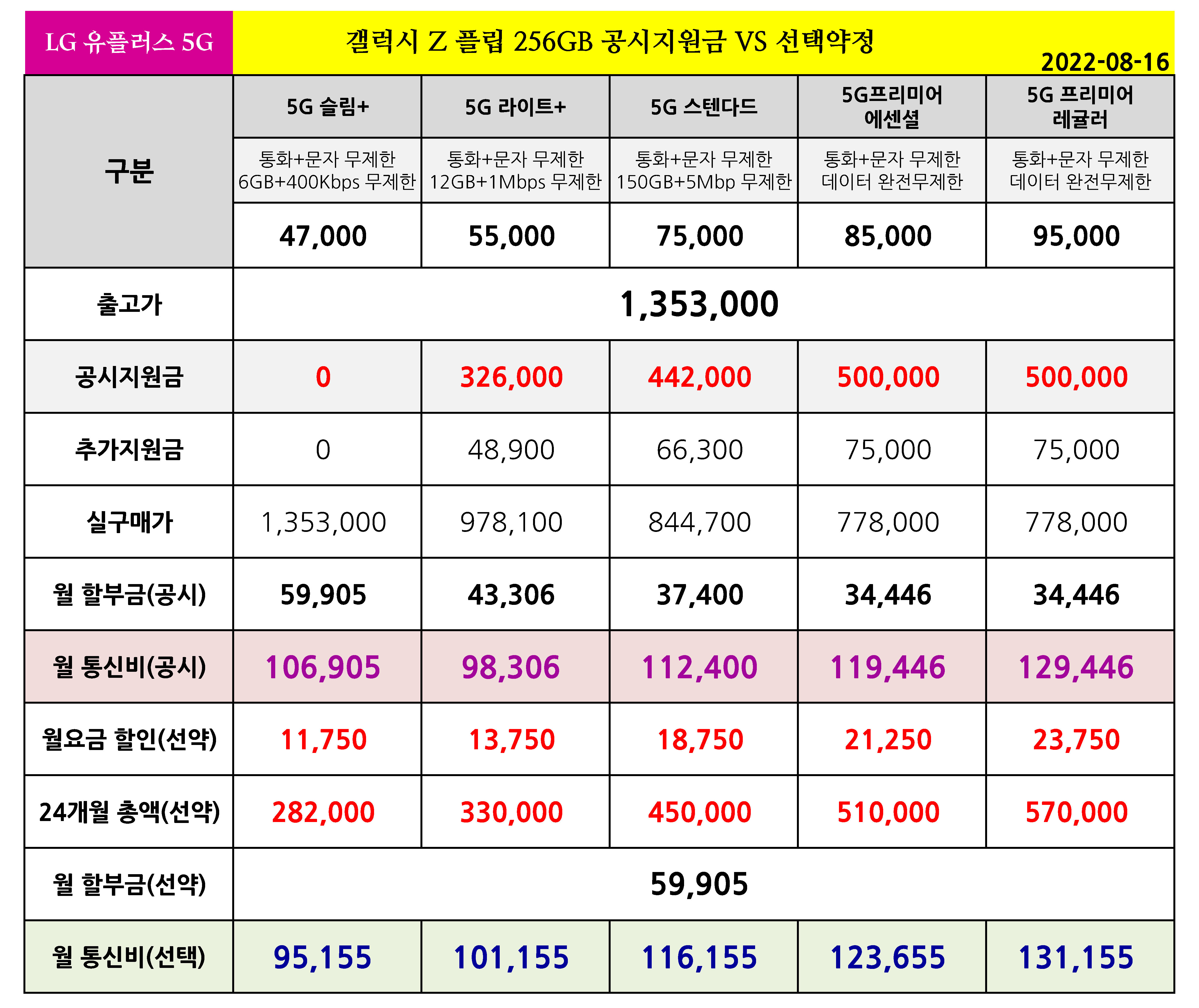 갤럭시 Z 플립4 256GB 공시지원금 VS 선택약정 월 통신비 비교