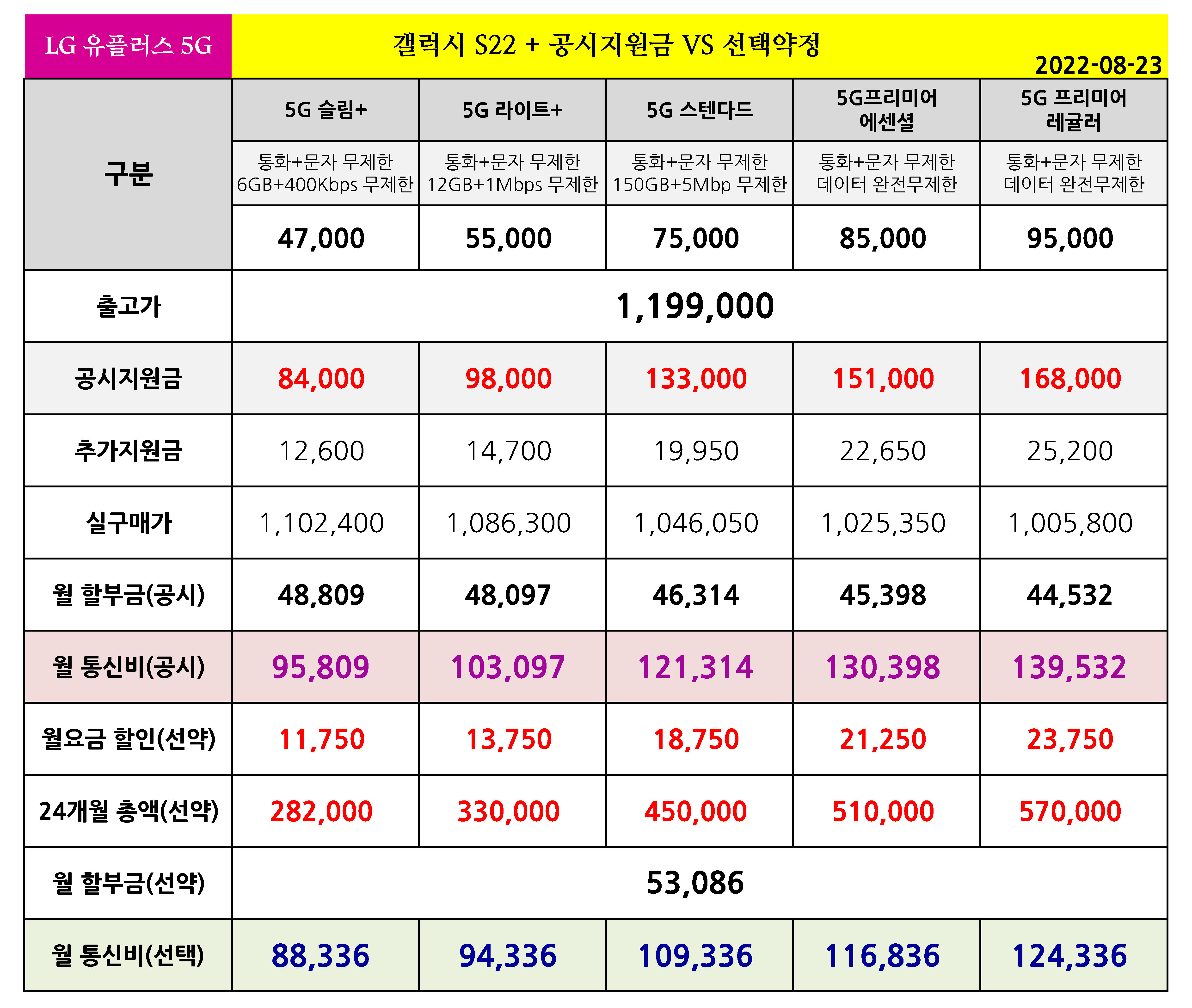 갤럭시 S22 플러스 공시지원금 VS 선택약정 월 통신비 비교 - 8월 23일 기준