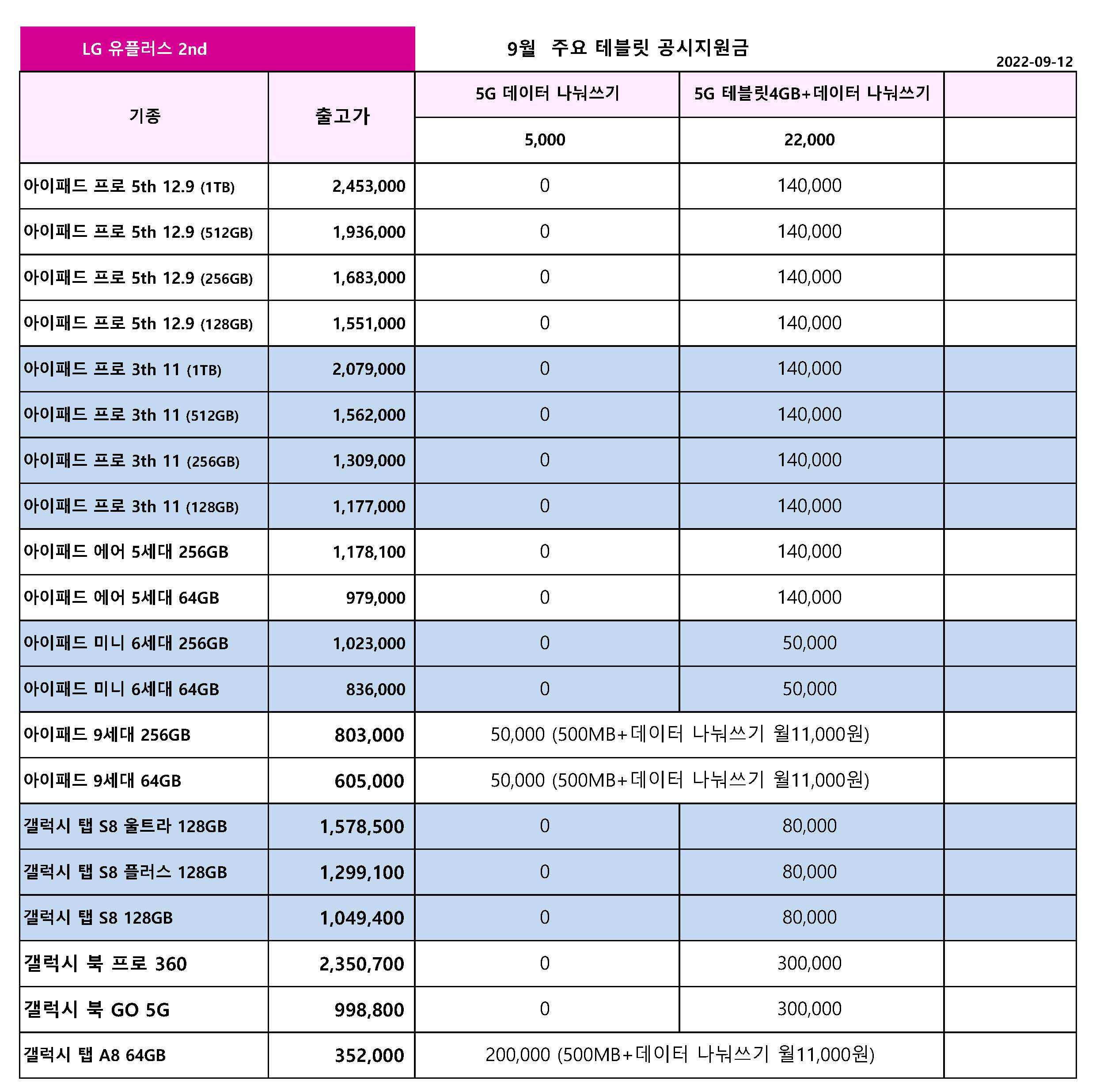 9월 LG 유플러스 주요 핸드폰 공시지원금 정리 - 9월 12일 기준