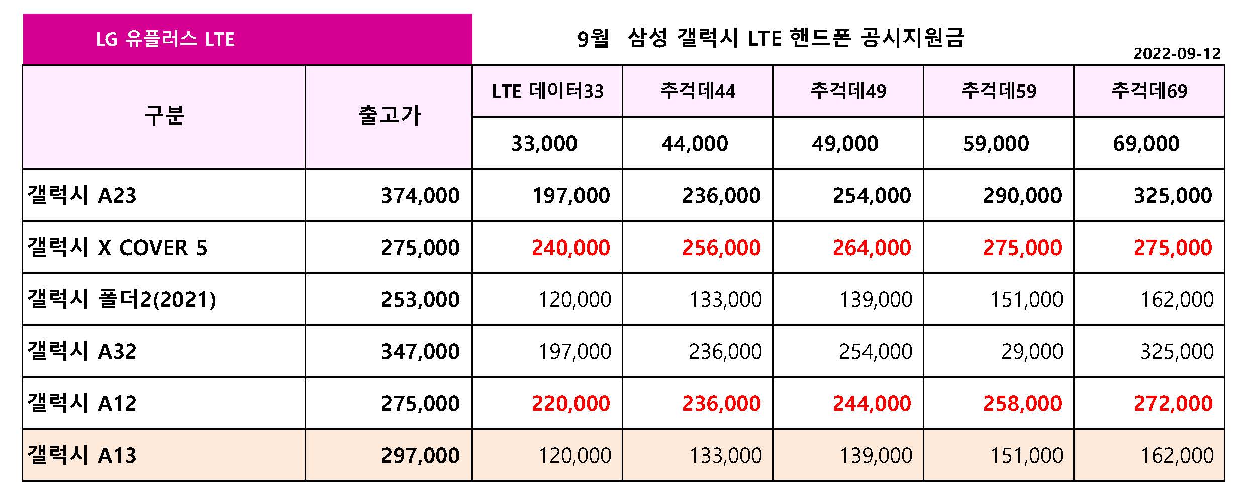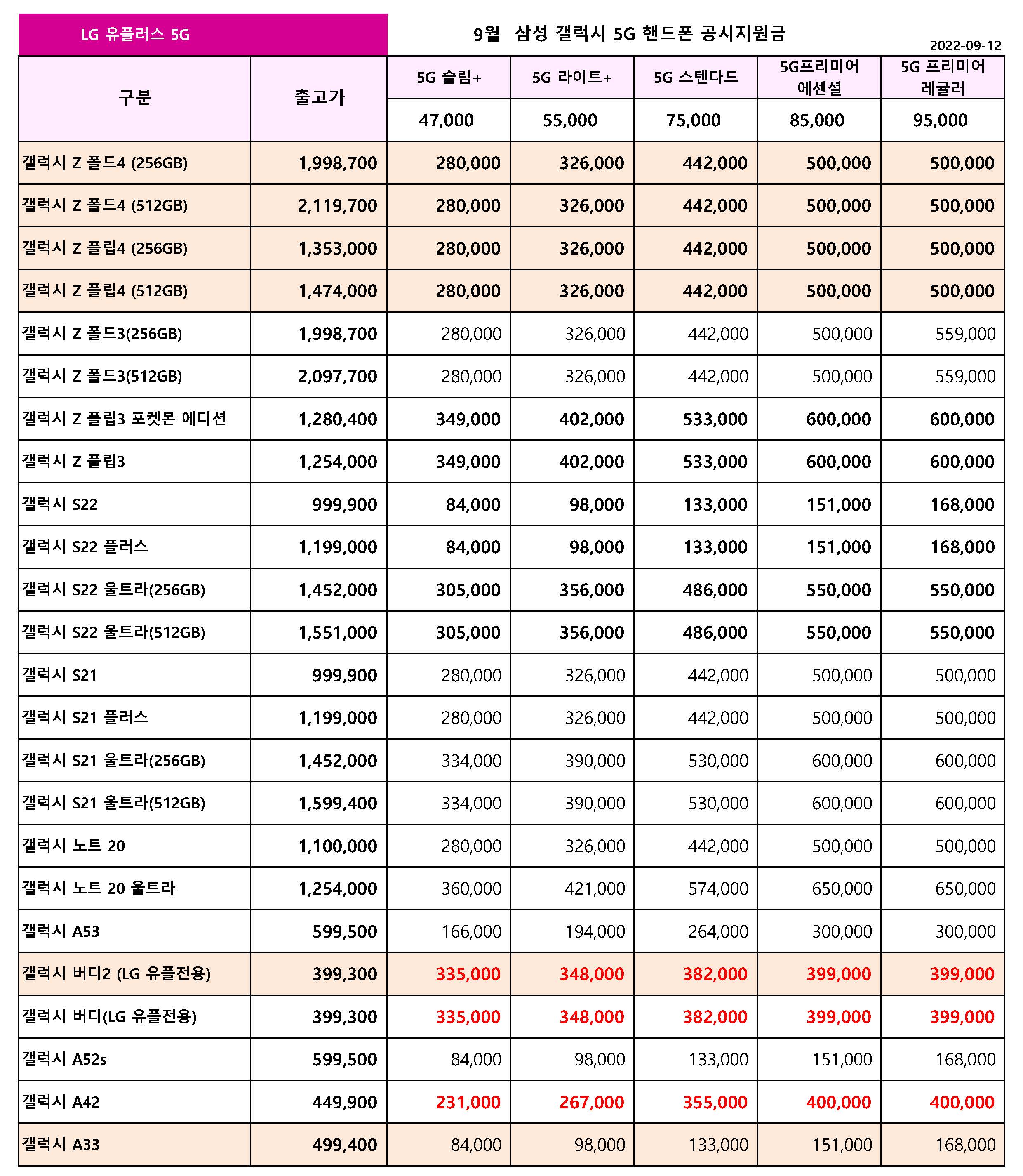 9월 12일 기준 LG 유플러스 주요 핸드폰 공시지원금 입니다.