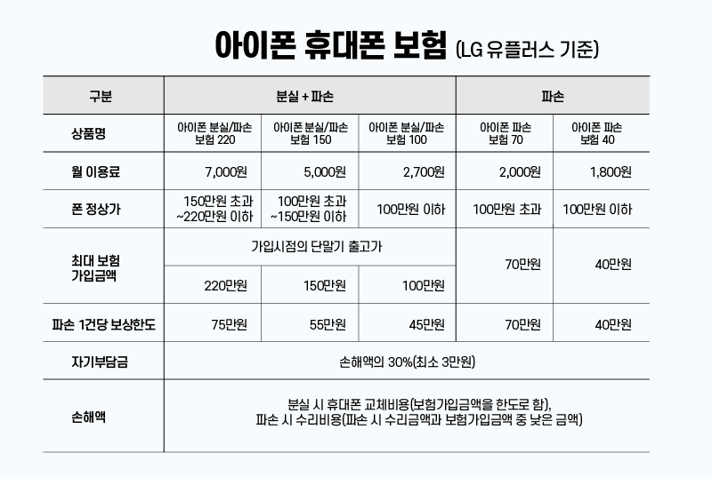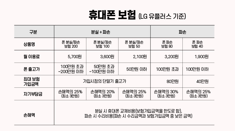 - LG 유플러스 기준의 보험료지만, 대부분의 통신사 보험은 비슷한 가격에 비슷한 보장을 합니다.