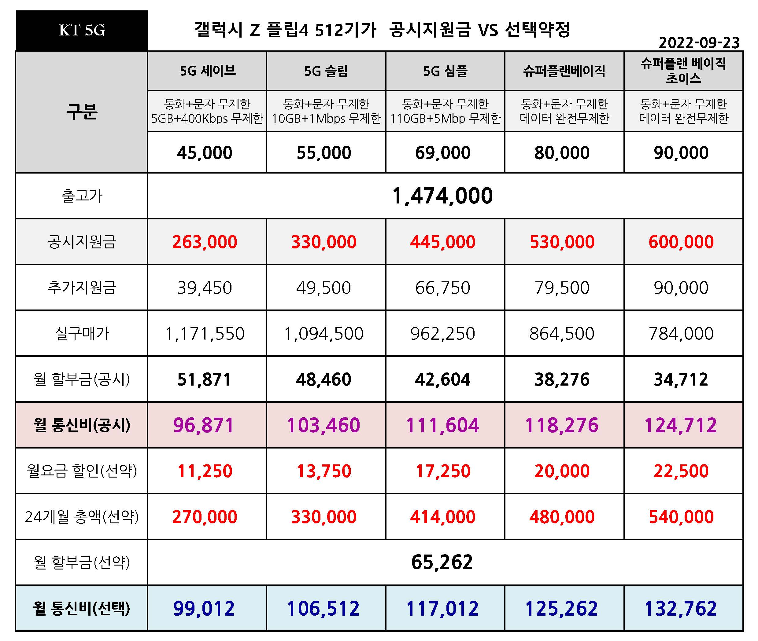 갤럭시 Z 플립4 512기가 공시지원금 VS 선택약정 월 통신비 비교 - 9월 23일 기준