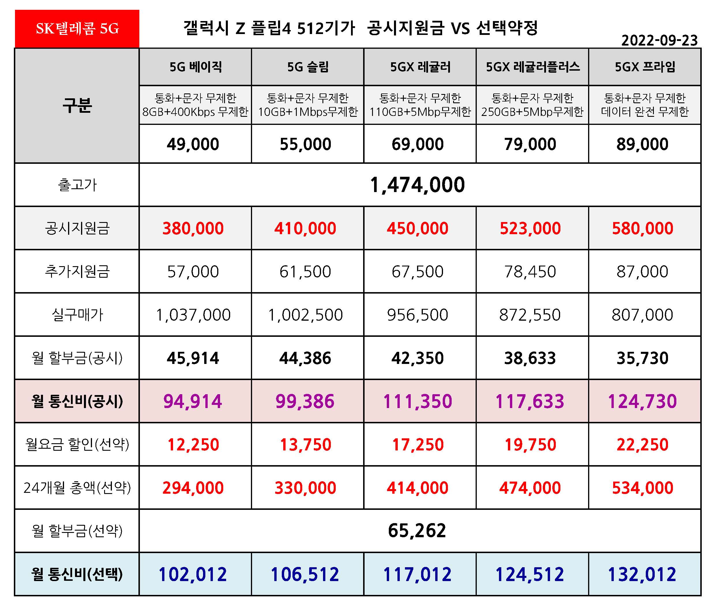 갤럭시 Z 플립4 512기가 공시지원금 VS 선택약정 월 통신비 비교 - 9월 23일 기준