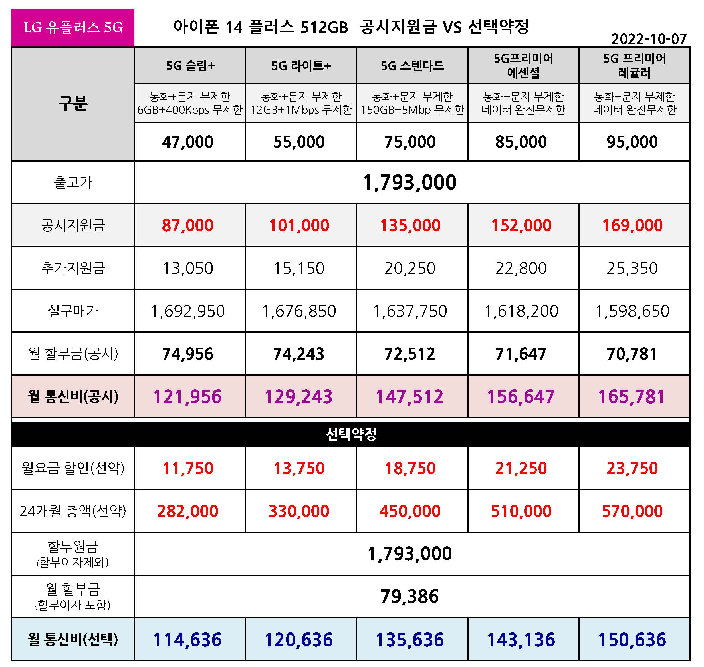 아이폰 14 플러스 128기가 공시지원금 VS 선택약정 월 통신비 비교 - 10월 7일 기준