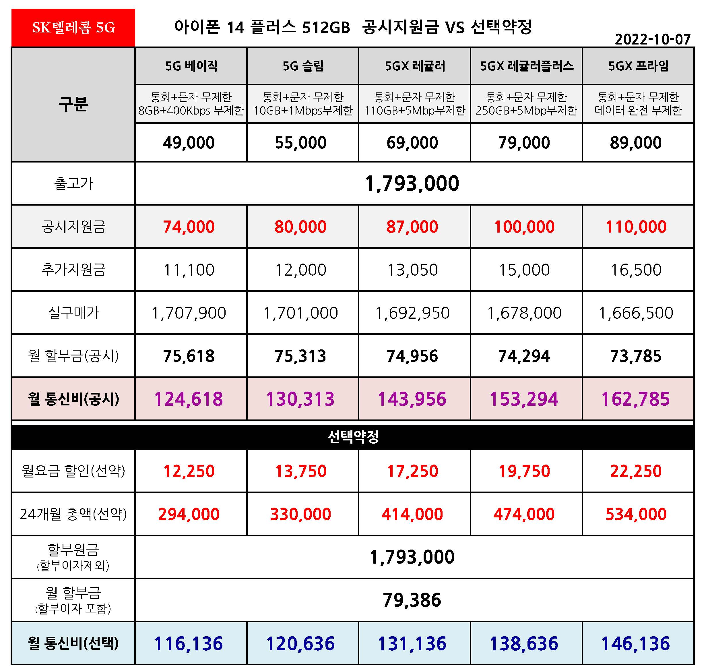 아이폰 14 플러스 128기가 공시지원금 VS 선택약정 월 통신비 비교 - 10월 7일 기준