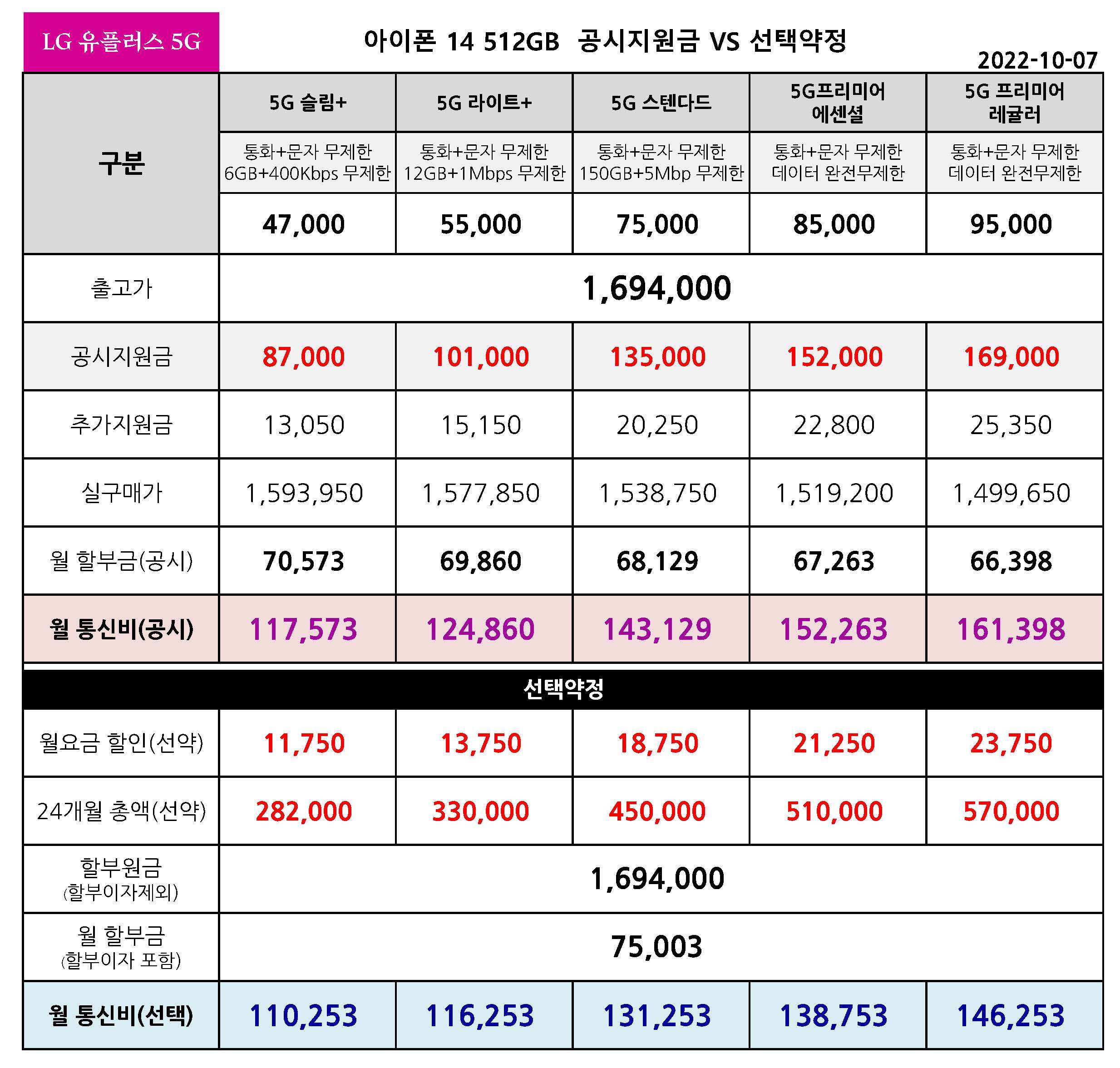 아이폰 14 512기가 공시지원금 VS 선택약정 월 통신비 비교 - 10월 7일 기준
