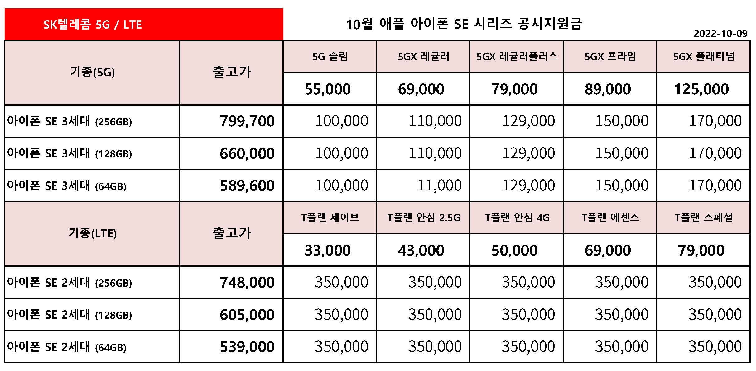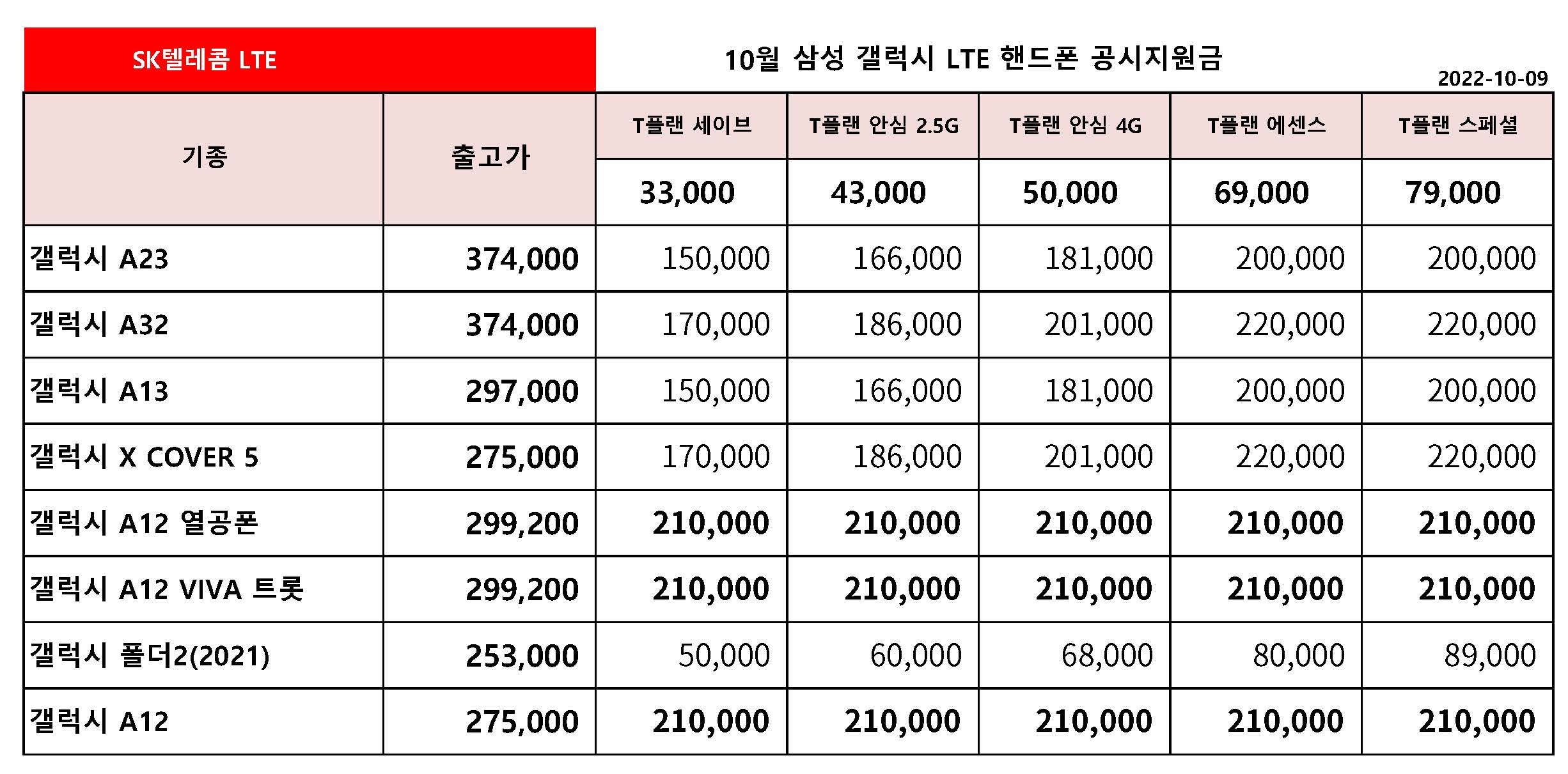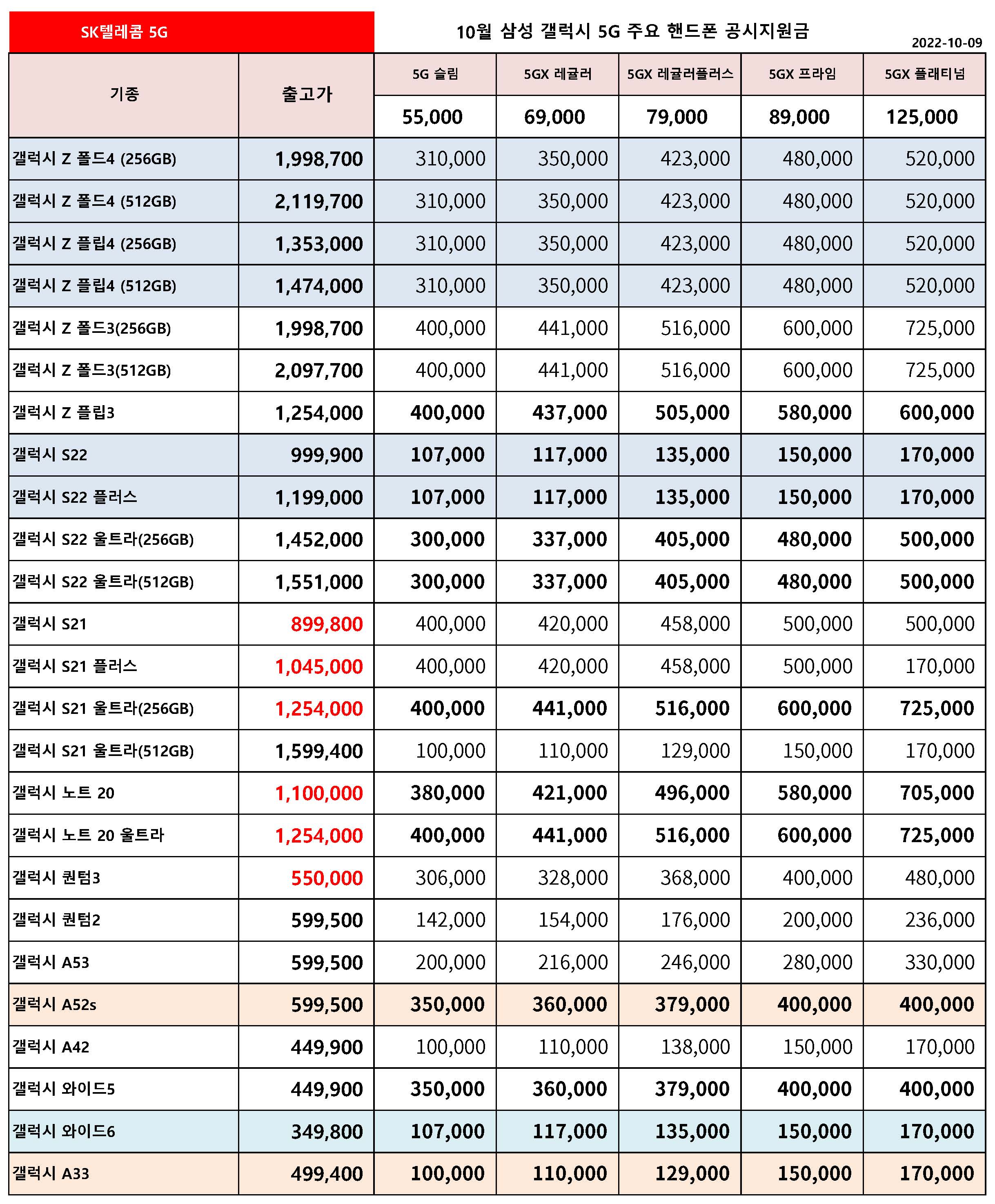 10월 SK텔레콤 주요 핸드폰 공시지원금 정리 - 10월 9일 기준