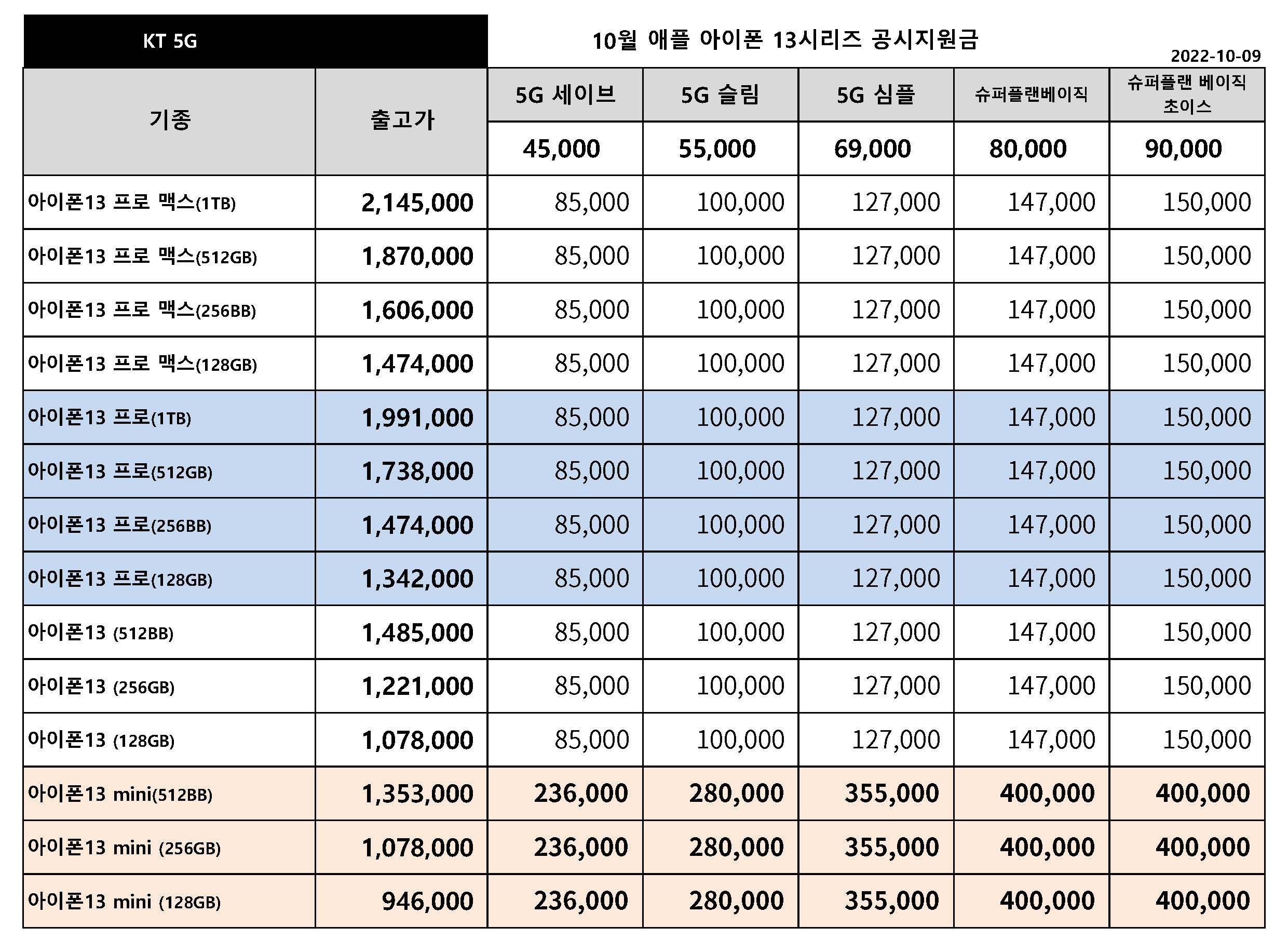 10월 KT 주요 핸드폰 공시지원금 정리 입니다.