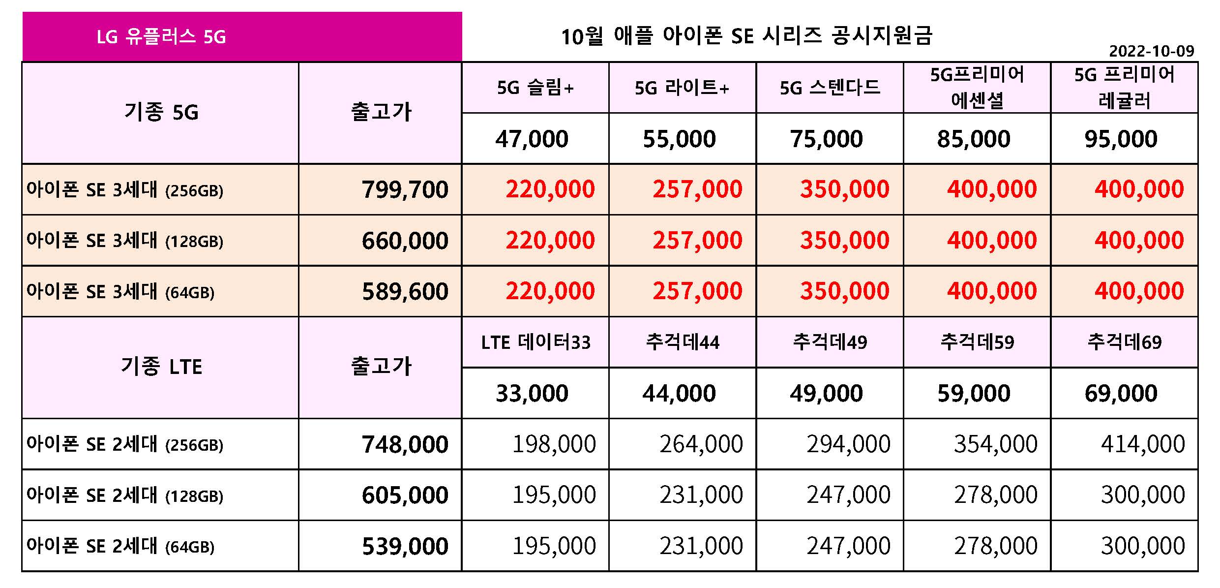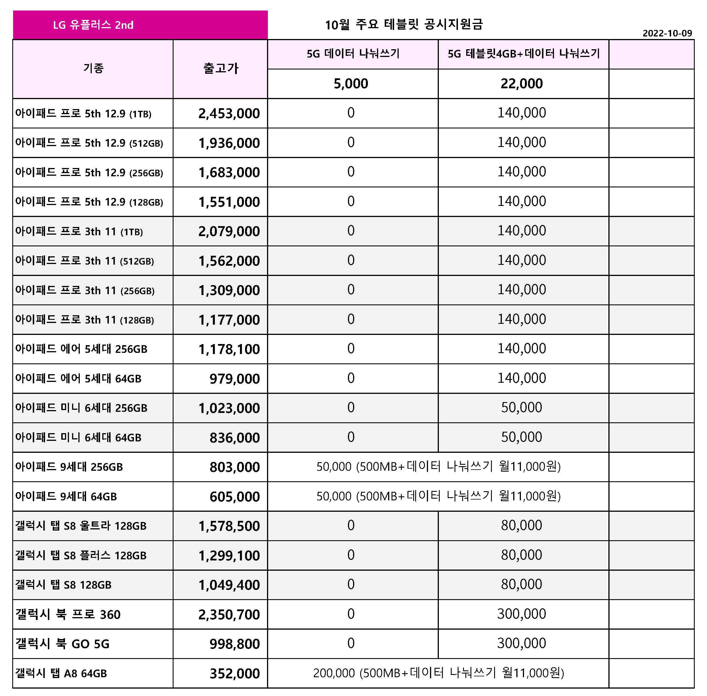 10월 LG 유플러스 주요 핸드폰 공시지원금 정리 - 10월 9일 기준