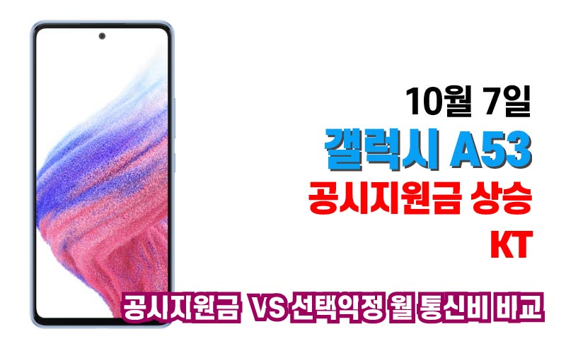 10월 7일 KT 갤럭시 A53 공시지원금이 상향 되었습니다.
