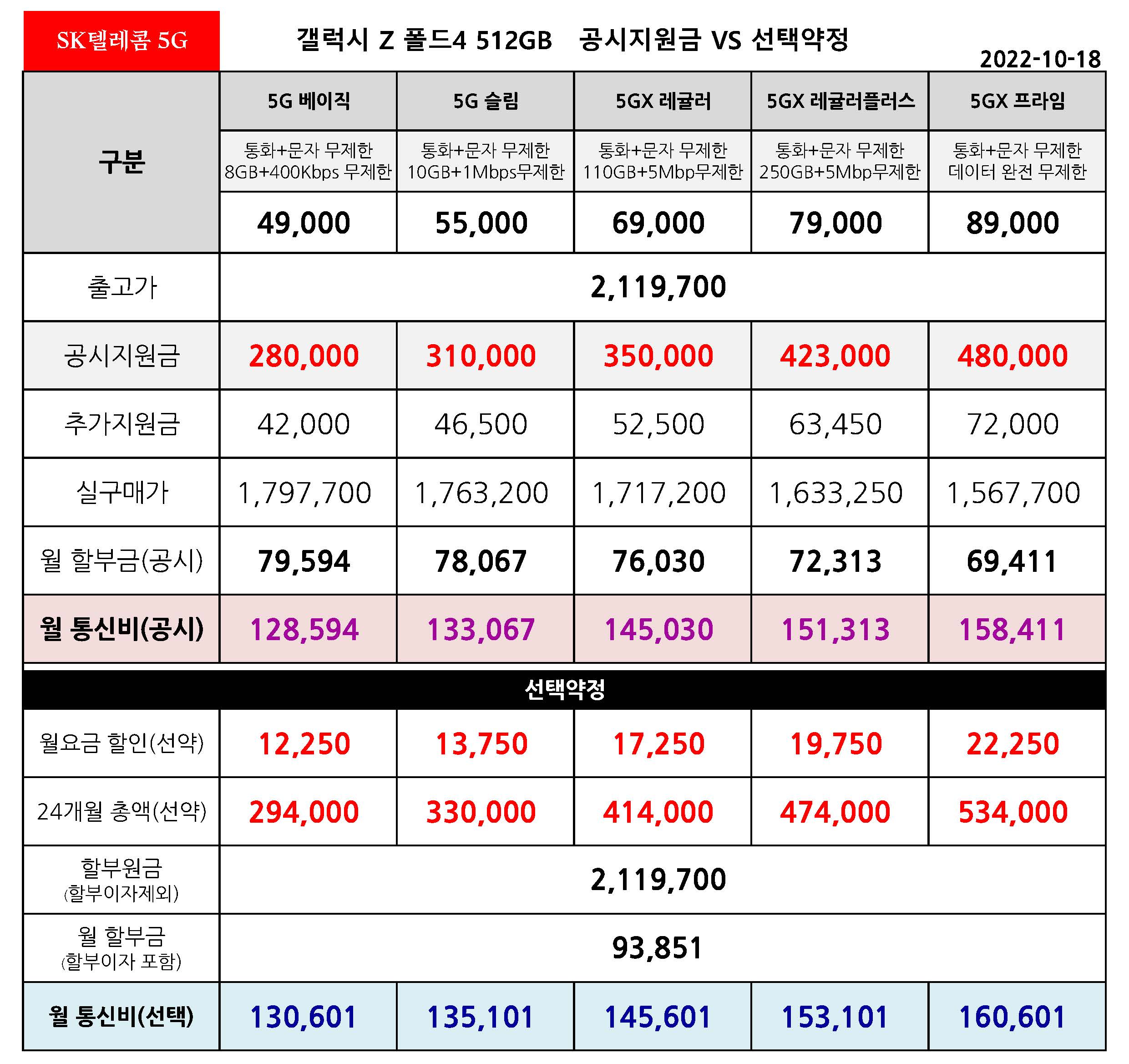갤럭시 Z 폴드4 512기가 공시지원금 VS 선택약정 월 통신비 비교