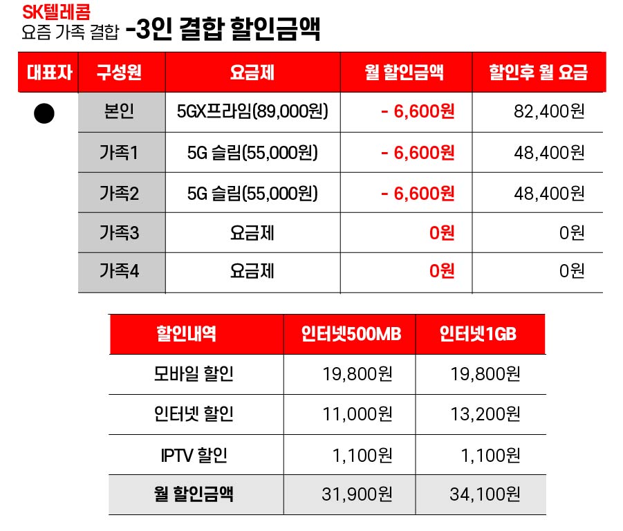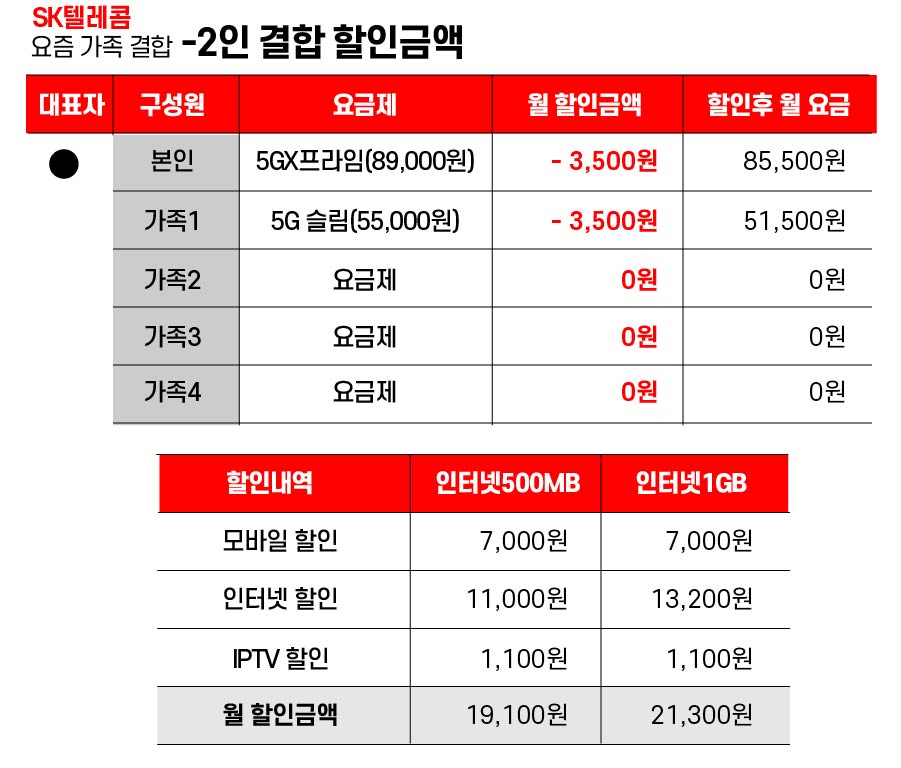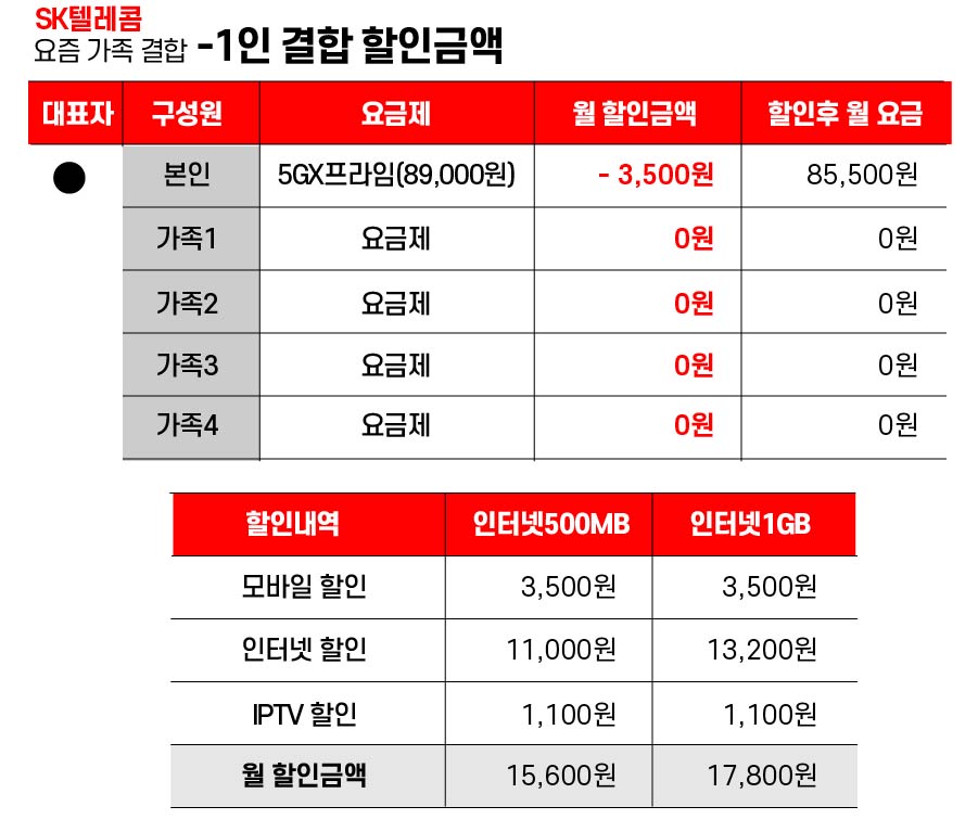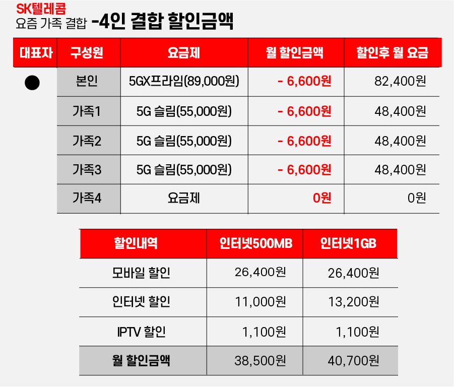 - 1인~5인 결합시 모바일, IPTV 할인 금액은 동일하며, 인터넷 500MB , 1GB 차이에 따라 2,200원 차이가 납니다.