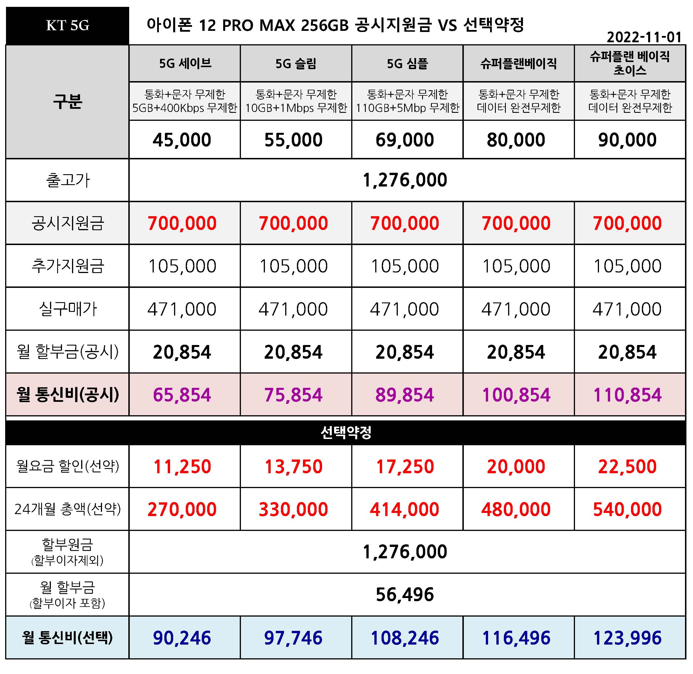 KT 아이폰 12 PRO MAX 공시지원금 VS 선택약정 월 통신비 비교
