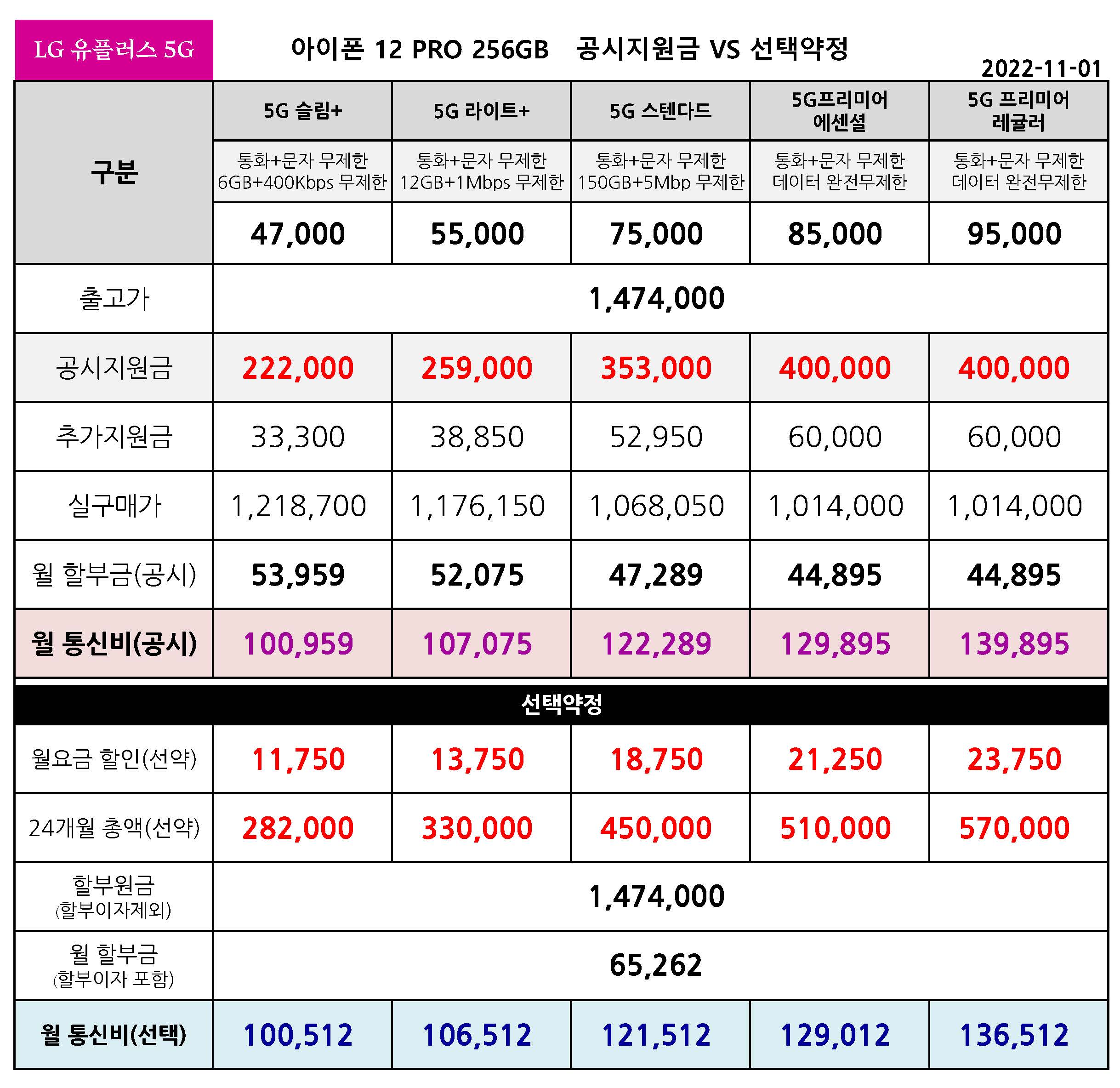 LG 유플러스 아이폰 12 PRO MAX 공시지원금 VS 선택약정 월 통신비 비교