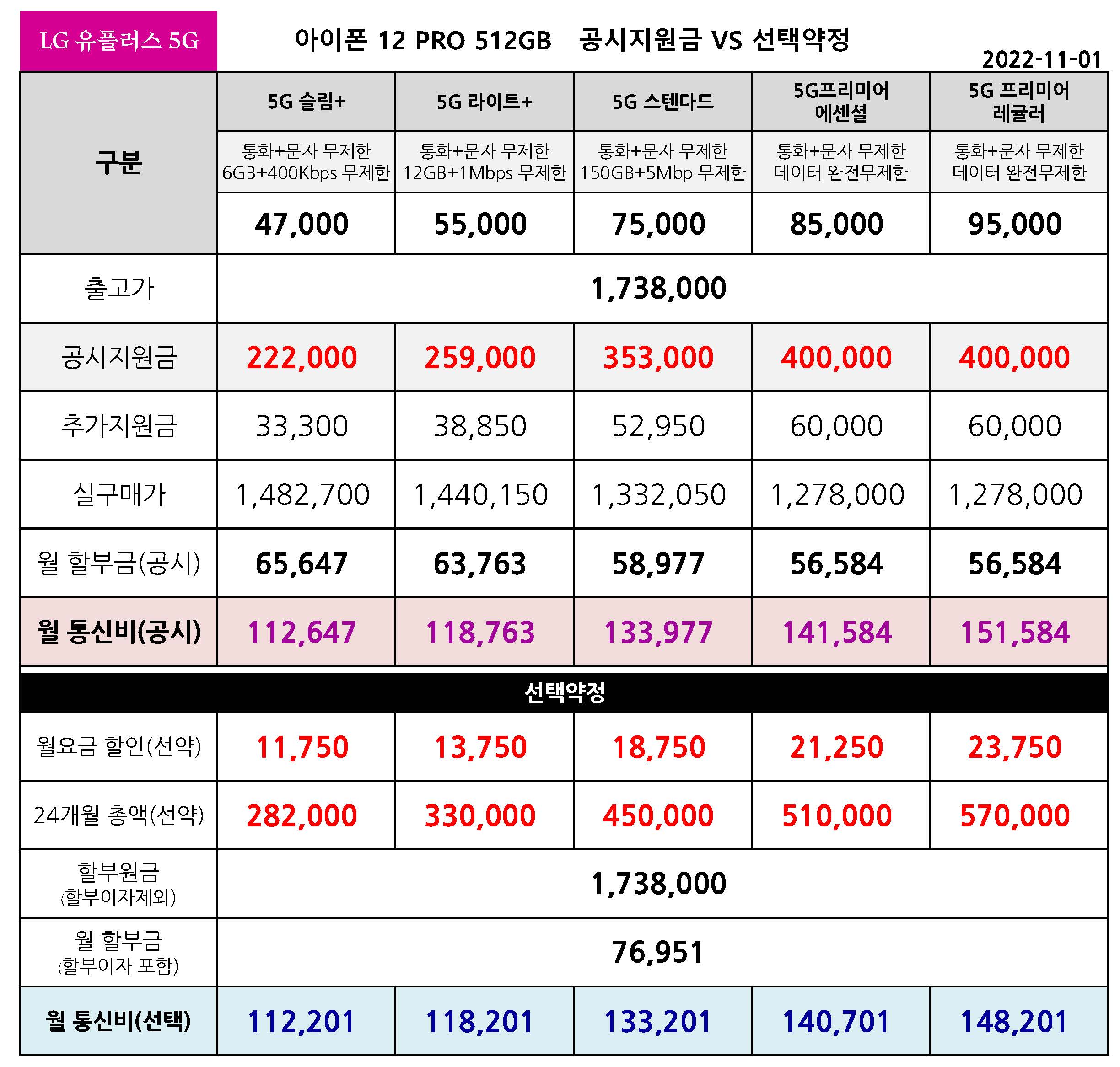 LG 유플러스 아이폰 12 프로 공시지원금 VS 선택약정 월 통신비 비교