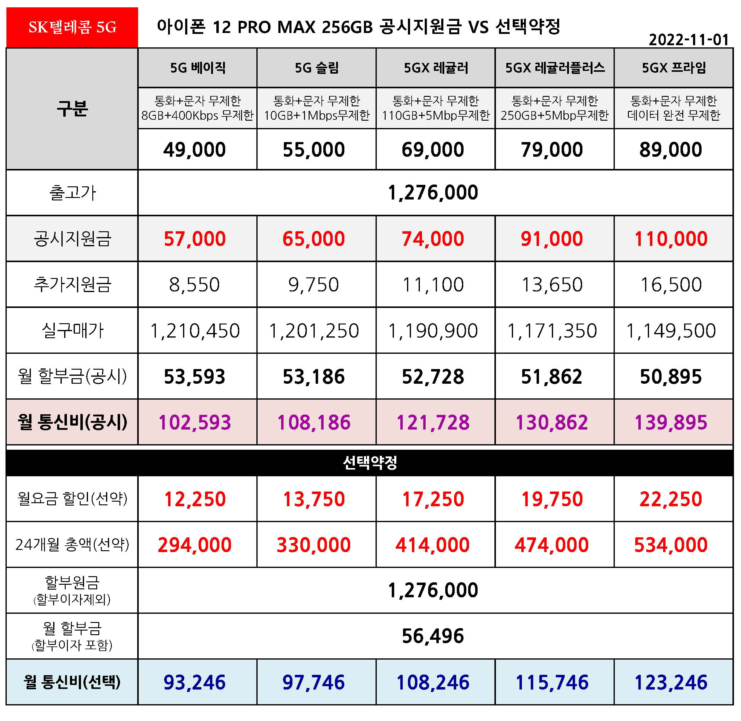 SK텔레콤 아이폰 12 PRO MAX 공시지원금 VS 선택약정 월 통신비 비교
