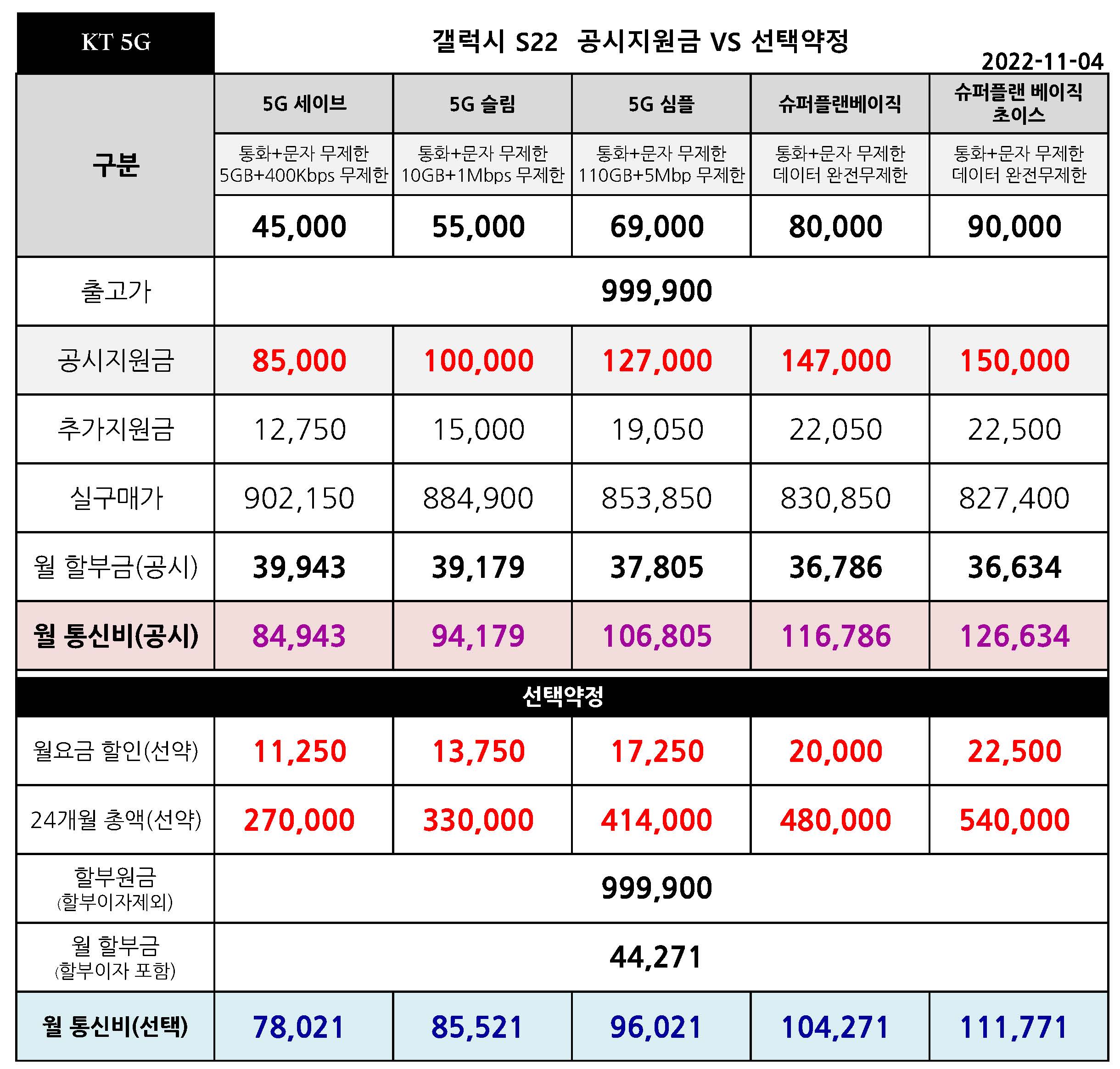 갤럭시 S22 공시지원금 VS 선택약정 월 통신비 비교 - 11월 4일 기준